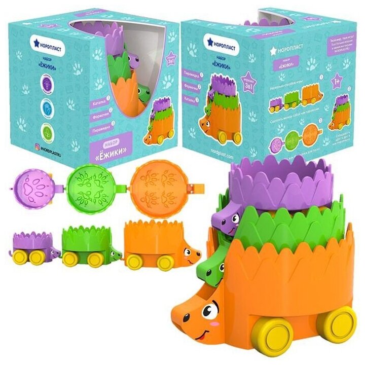 Пирамидка-паровозик Ежики станет самой любимой игрушкой вашего ребенка. Складывайте, соединяйте и дайте волю своему воображению! В колючках каждого ежа прячется другой ежик, поменьше и симпатичнее предыдущего. Сцепляйте их между собой от папы к ребенку. Каждого ежика можно использовать как формочку для песка со своим индивидуальным рисунком. Игрушка развивает моторику, логическое мышление и социальные навыки у детей.