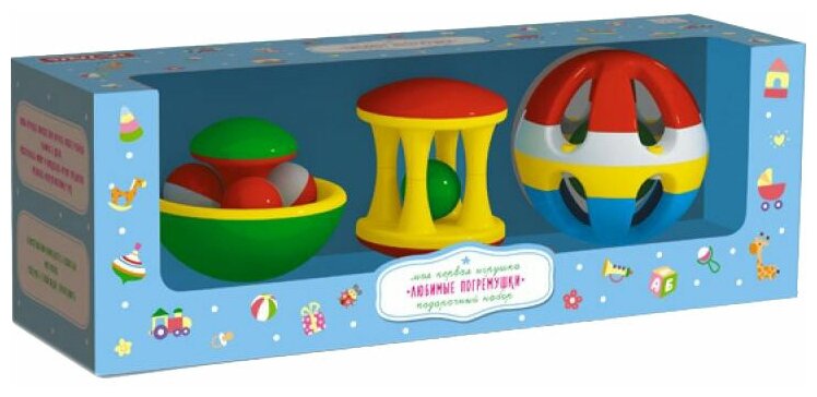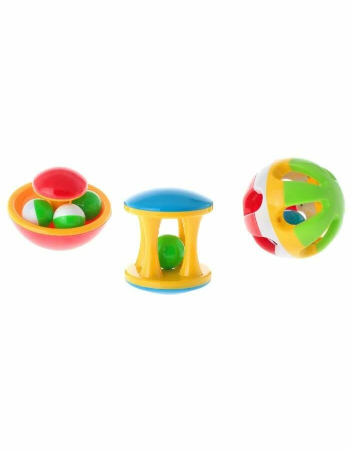 Подарочный набор погремушек заинтересует новорожденных своими цветами и звуками перекатывавшихся шариков. Малышей постарше привлечет возможность исследовать погремушки. Им понравится пробовать вытаскивать шарики (шарики не достаются), проталкивать их пальчиками через отверстия, катать игрушки по наклонным и прямым поверхностям. Погремушки особенно полезны благодаря своим формам. Отсутствие привычных рукояток заставляет малышей каждый раз искать разные способы, чтобы захватить привлекательные игрушки.