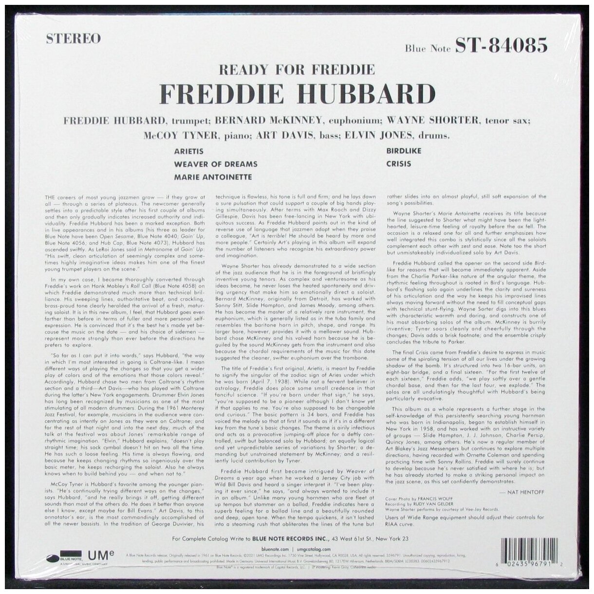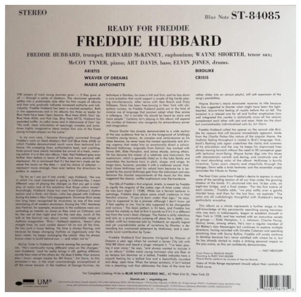 Ready For Freddie - четвёртый и один из самых знаменитых альбомов американского джазового музыканта Freddie Hubbard. Пластинка вышла в 1961 году и стала первой совместной работой с саксофонистом Wayne Shorter. Помимо этих двух, в записи принимали участие и другие выдающиеся деятели джаза - Bernard McKinney, McCoy Tyner, Art Davis и Elvin Jones. Кроме всего прочего, известный музыкальный критик Scott Yanow включил эту работу в свое эссе 17 наиболее выдающихся хард-боп записей. Релиз представлен на черном 180-граммовом виниле. Издание в серии Blue Note Classic Vinyl Series ремастировано с оригинальных аналоговых мастерлент. Freddie Hubbard (1938-2008 гг.) - американский джазовый трубач. Первый успех пришёл к нему в 60-х годах, когда он исполнял композиции в жанрах би-боп, хард-боп и пост-боп. Неповторимый стиль музыканта открыл новые перспективы би-бопа и оказал огромное влияние на последующее развитие джазовой музыки. Хаббард выпускал не только сольные работы, но и сотрудничал с другими известными исполнителями своего времени - Art Blakey, Walter Benton, George Benson, John Coltrane, Herbie Hancock и прочими.