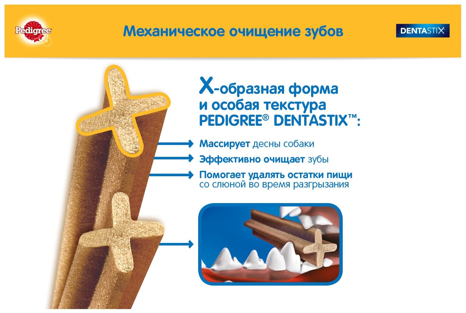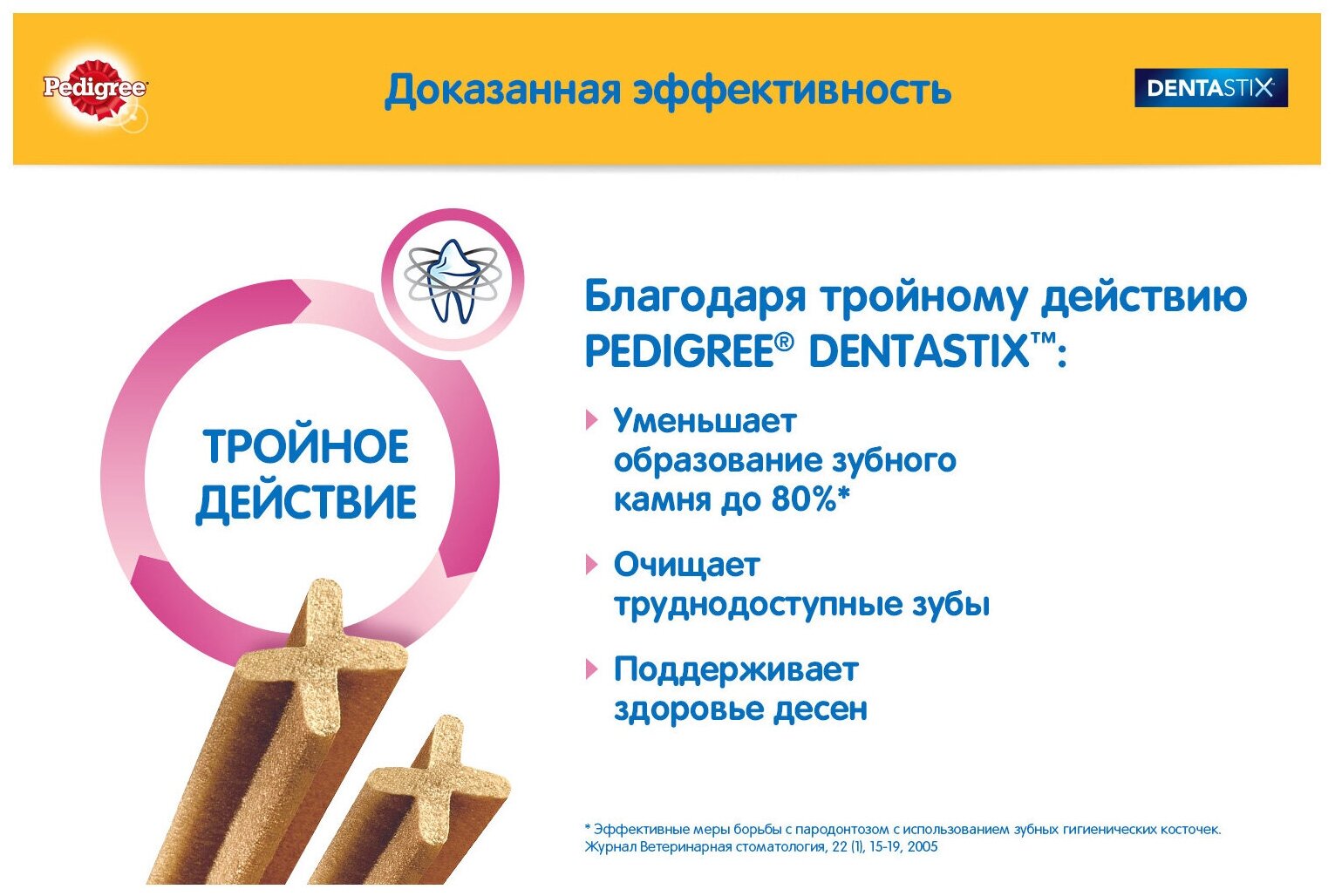 | Рекомендации | Большинство собак старше 3 лет страдают заболеваниями зубов и десен. PEDIGREE® рекомендует давать собаке Denta Stix, так как он не только механически чистит зубы, но и содержит активные компоненты, которые предотвращают риск развития заболевании? полости рта. Клинически доказано, что ежедневное использование Denta Stix от PEDIGREE® до 80% уменьшает образование зубного камня, предотвращая риск развития заболеваний. Нужно помнить, что Вы можете чистить собаке зубы с помощью зубной щетки или ежедневно давать ей лакомство по уходу за зубами Denta Stix от PEDIGREE®. Для собак крупных пород, например, лабрадор - одна палочка в день. Не подходит для щенков моложе 4-х месяцев. Кроме того, у вашей собаки всегда должен быть доступ к чистой питьевой воде. |