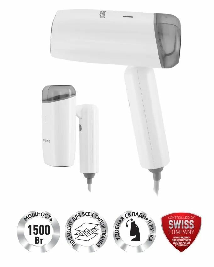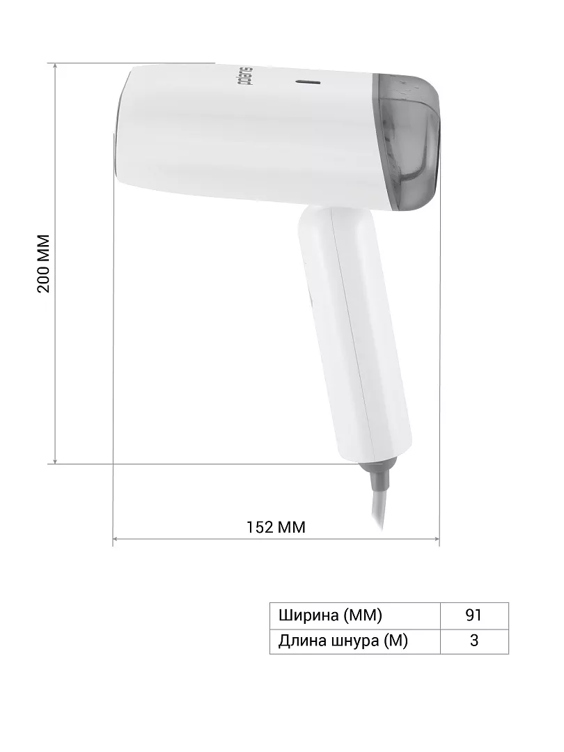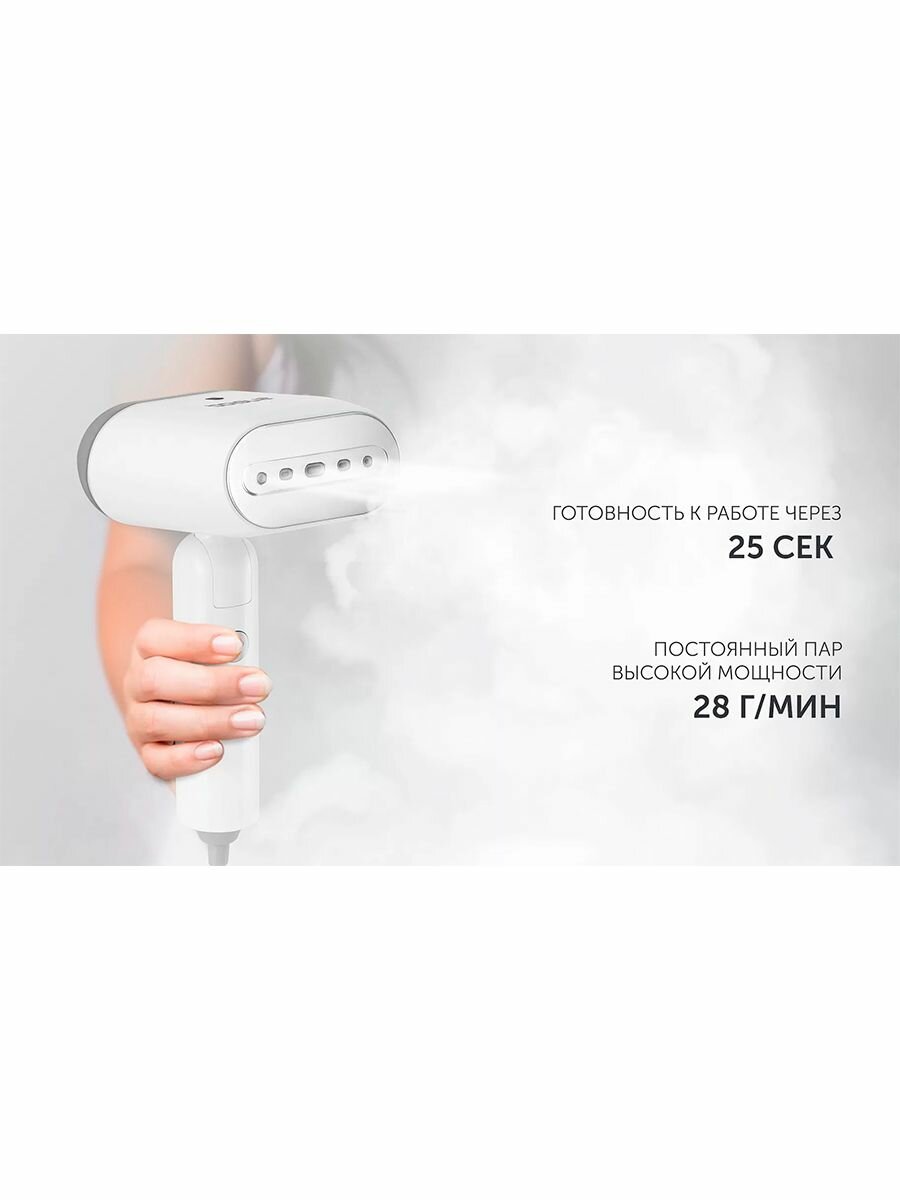 Готовность к работе через 25 сек. Постоянный пар 28 г/мин. Складная ручка для удобного хранения. Съемный резервуар для воды емкостью 110 мл. Использование без гладильной доски. Безопасен для всех типов ткани. Горизонтальное и вертикальное отпаривание. Длина сетевого шнура 3 м.