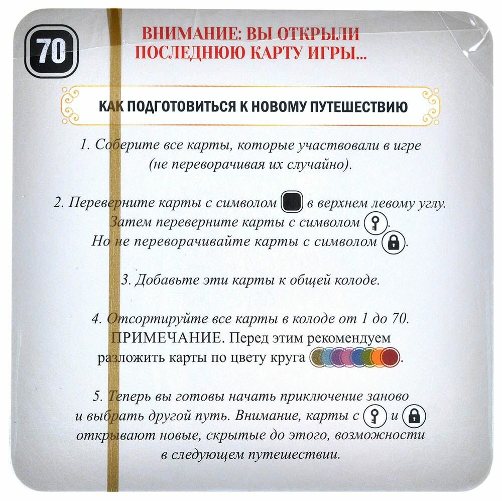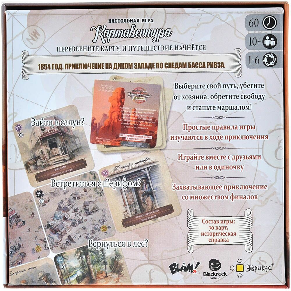«Картавентура. Оклахома» – 4-я часть настольнойповествовательной игры из серии «Картавентура». США, 1854 год, вы - Басс Ривз, рождённый в семье рабов. Всю свою жизнь вы провели на хлопковых плантациях. Но однажды вам выпадает шанс изменить судьбу. Удастся ли вам ли вам сбежать и обрести свободу? Какую жизнь вы выберете: в резервации с индейцами или станете маршалом США? Принимайте решения и сценарий приведёт вас к цели.В начале игры перед вами лежит колода из 70 карт. Чтобы начать, переверните первую карту и следуйте инструкциям. Постепенно сформируется карта местности, на которой вас будут ждать персонажи, предметы, опасности и большое количество сюжетных развилок. Выбирайте действия, развивайте сюжетную линию и достигните одной из пяти концовок сценария. Игра будет пройдена, когда вы узнаете все 5 концовок.Кому подойдёт эта игра?Для любителей книг-игрДля любителей сюжетных игрДля тех, кому нравятся кооперативные игрыКомплектация: 70 карт, Историческая справка.