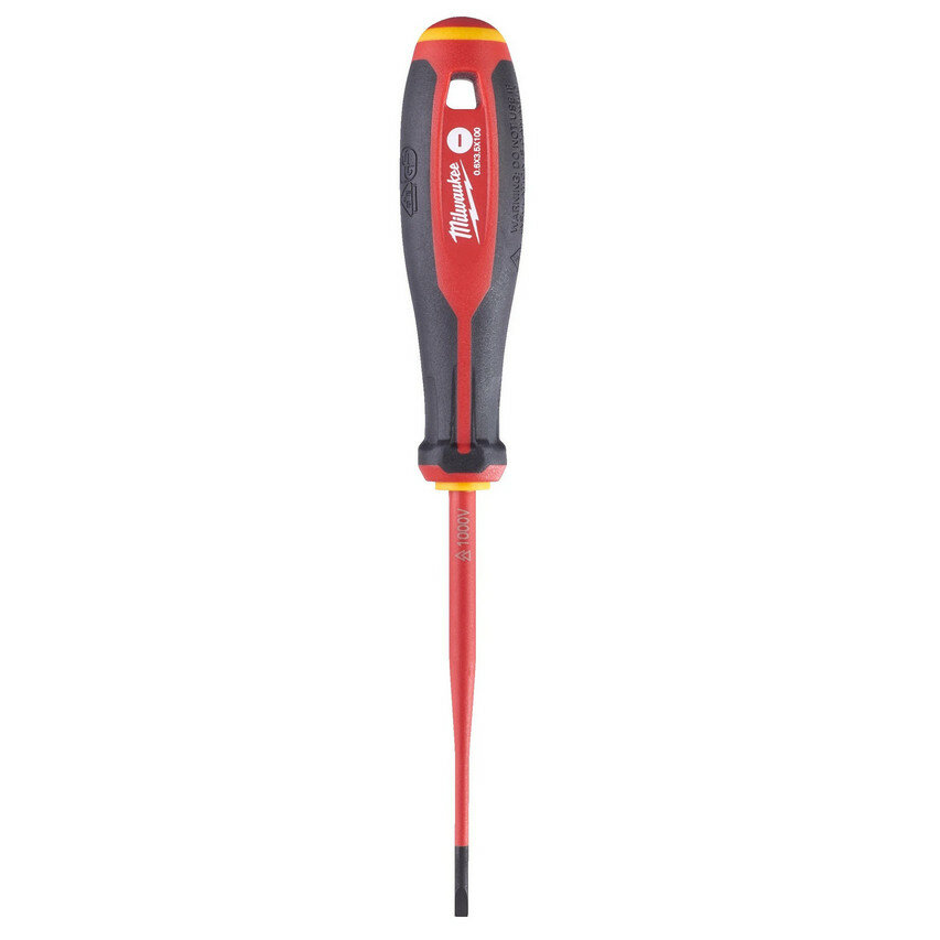 Отвертка диэлектрическая Milwaukee VDE SL0.6X100мм (714) протестирована по стандарту VDE напряжением 10кВ и предназначена для работы в электроустановках под напряжением 1кВ.