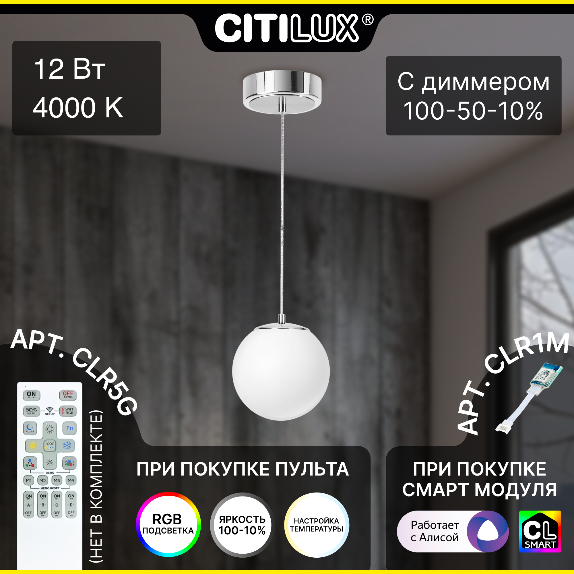 Светильник подвесной (без пульта) светодиодный Citilux Адам Смарт CL228B011 выполнен в современном стиле. Подвес одинарный, основание из ударопрочного полимера, цвет матовый хром. Плафон в форме шара, изготовлен из оптического полимера, цвет белый матовый. В основании плафона расположен уникальный светодиодный модуль, обеспечивающий яркое основное освещение или красочную RGB подсветку (для управления подсветкой нужен пульт). Мощность 12Вт, световой поток 1300Лм. Предустановлено 4 режима освещения, с управлением обычным настенным выключателем.* Опционально: управляется радиопультом дистанционного управления артикул - CLR5G (не входит в комплект, приобретается отдельно или в комплекте с другими светильниками экосистемы Citilux);При наличии пульта доступны: плавная регулировка цветовой температурой в диапазоне 3000-5500К, позволяет настроить любые оттенки теплого, нейтрального или холодного света; два режима работы RGB подсветки; плавная регулировка яркости света; есть режимы памяти и отсроченного выключения.При установке дополнительного смарт-модуля с артикулом CLR1M (не входит в комплект, приобретается отдельно) светильник становится умным. Используя сеть Wi-Fi, при наличии интернет-соединения, можно полноценно управлять всеми режимами работы светильника из приложения Citilux Smart со смартфона или планшета, а также с помощью голосовых помощников Алиса от Яндекс и Маруся от майл.