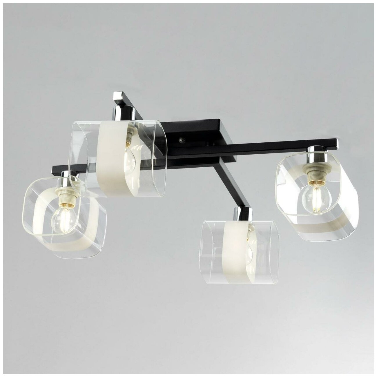 Потолочная люстра Citilux Вирта CL139145 в современном стиле. Корпус металлический, цвет чёрный матовый, с декоративными хромированными элементами. Плафоны стеклянные, прозрачные, со стильной белой полосой. В изделии используются 4 лампы с цоколем Е14, форма колбы шарик, максимальной мощностью для ламп накаливания 60Вт (В комплект не входит приобретаются отдельно). Светильник можно использовать как с одноклавишным, так и с двухклавишным выключателем. Подходит для всех типов потолков, в том числе натяжных. Люстра четырёхрожковая, квадратной формы, размер 52х52см, высота 18см.