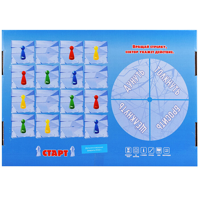 Комплектность: песочные часы, 48 карточек, 4 фишки, стрелка, игровое поле, инструкция.