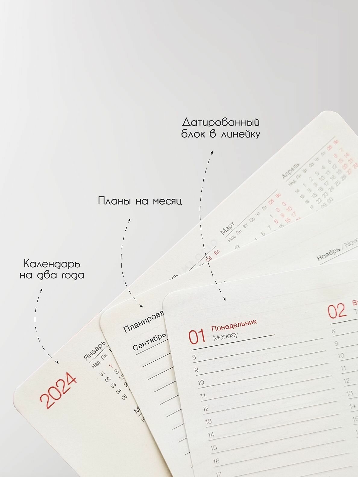 Обложка - интегральная, фактурная искусcтвенная кожа, цвет - розовый. Блок - датированный, 128 стр., прямые уголки, информационный блок,бумага: цвет - слоновая кость, 70 г/м2, печать 2+2.. Особенности: печать белой шелкографией.