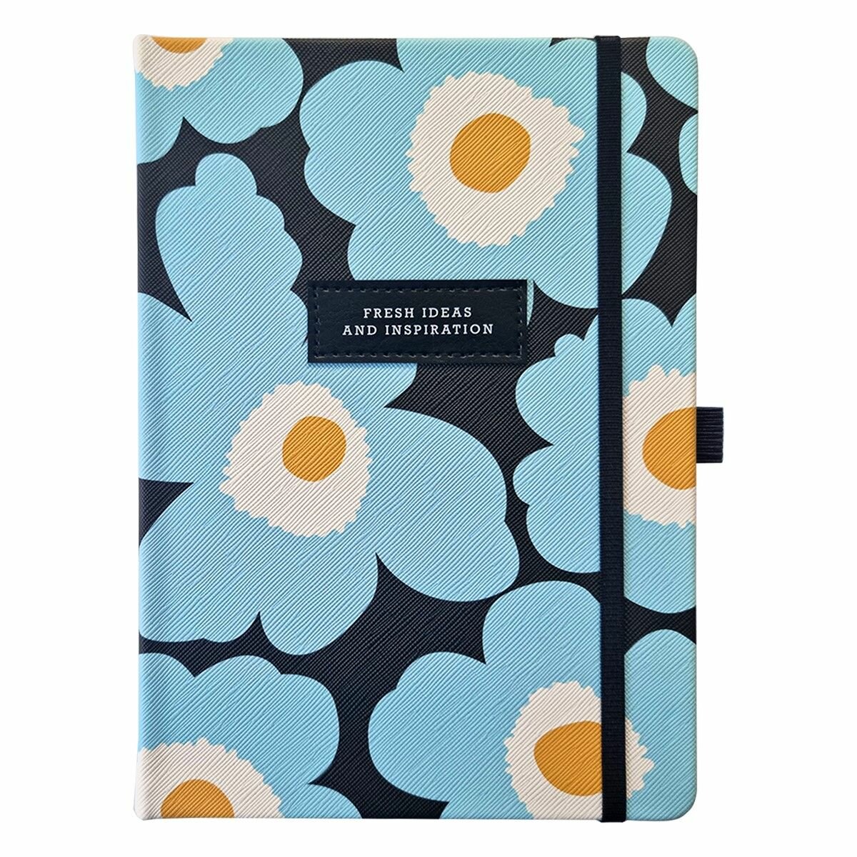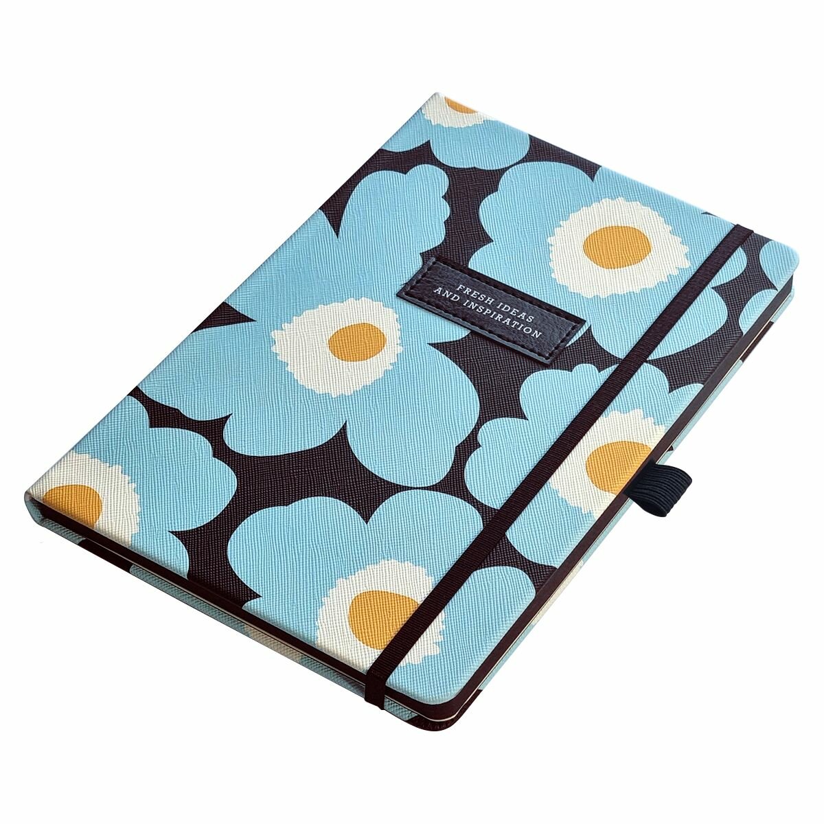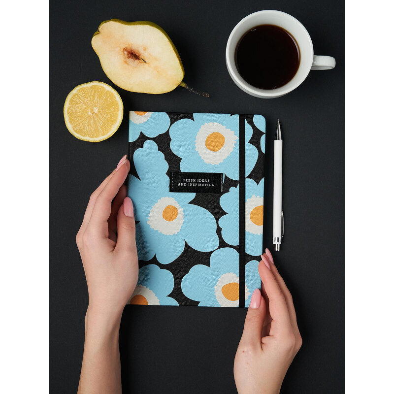 Обложка - твердая с резинкой, фактурная искусственная кожа с печатью по кожзаму, цвет - голубые цветы. Блок - недатированный, 192 стр., скругленные уголки, кармашек, 2 ляссе, бумага: слоновая кость, скругленные уголки, 70 г/м2, печать 2+2. Особенности: нашивка с печатью, белая шелкография.