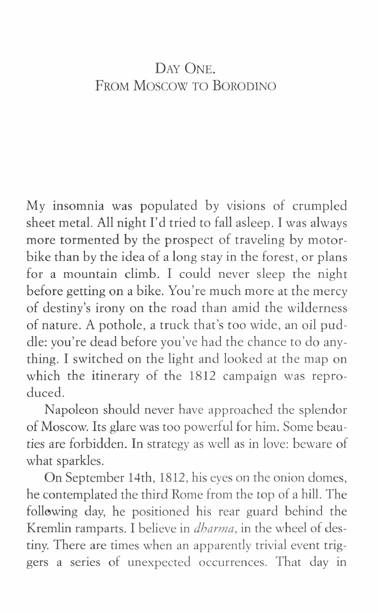 Two hundred years later, Sylvain Tesson, accompanied by four friends (two Russians and two French), decides to follow the route of the retreat. Perched on two Soviet Ural sidecar motorcycles, they will rejoin Paris from Moscow, guided only by the spectres of the two hundred thousand soldiers who died through cold, starvation, and in battle. Twenty five hundred miles travelled in a wild escapade to salute the ghosts of history, across the white plains of Russia.