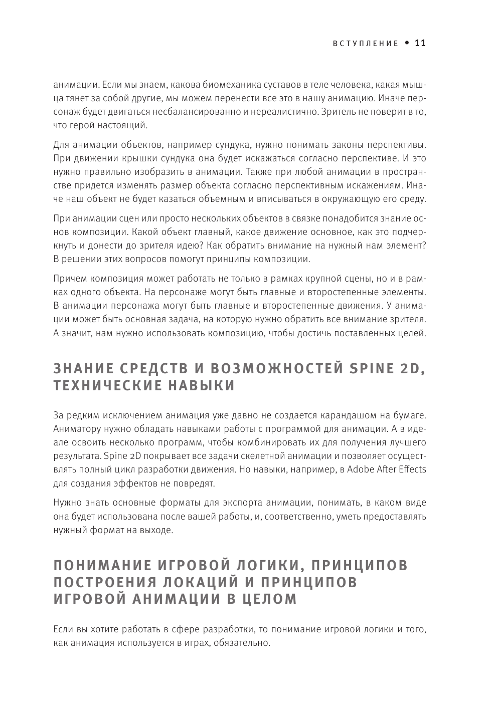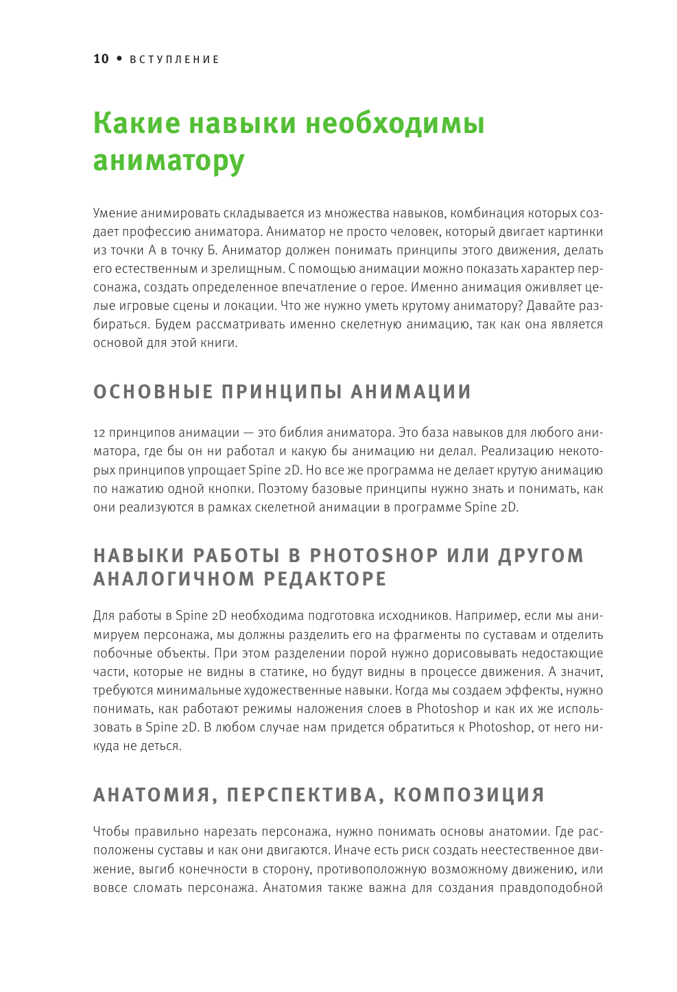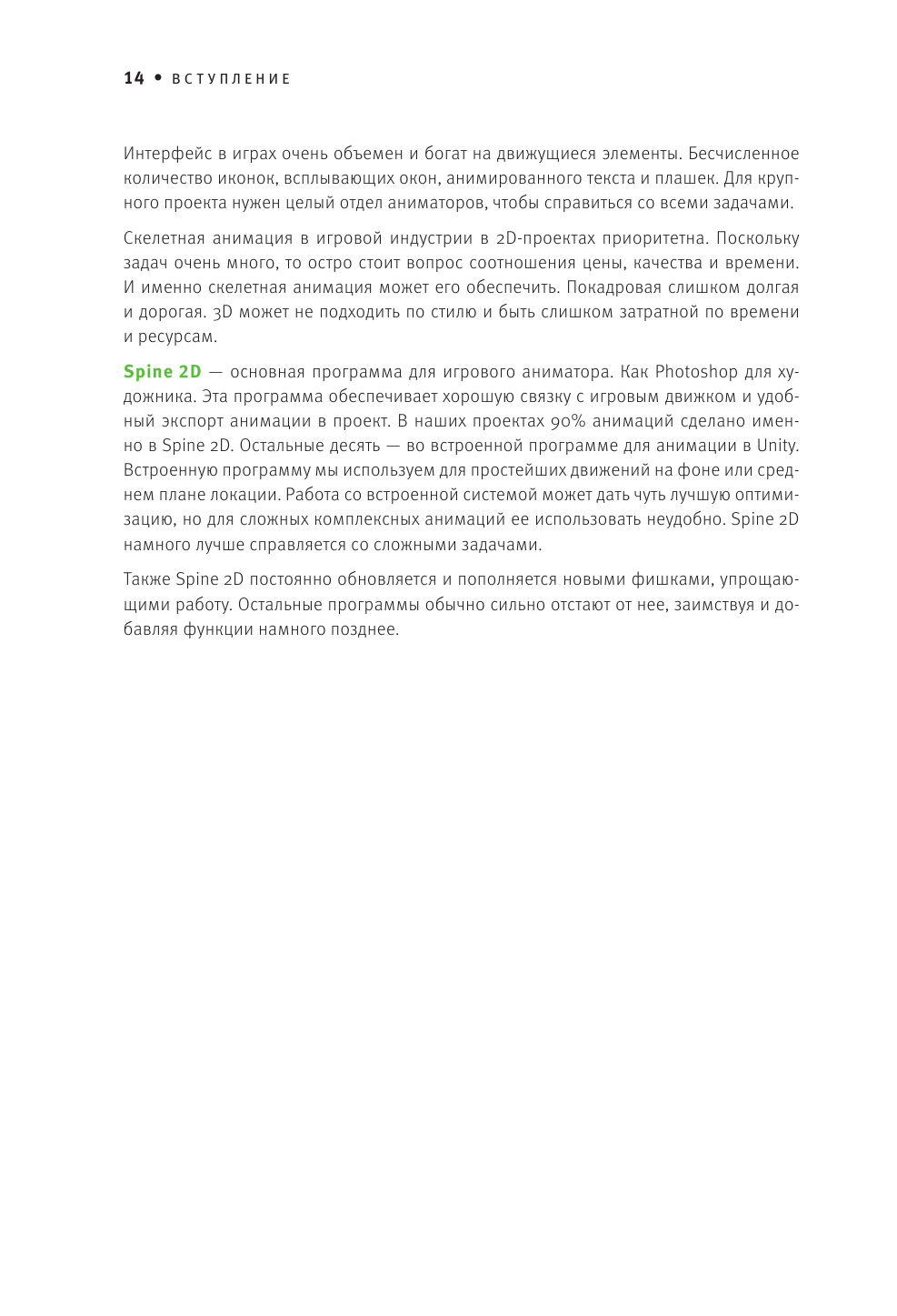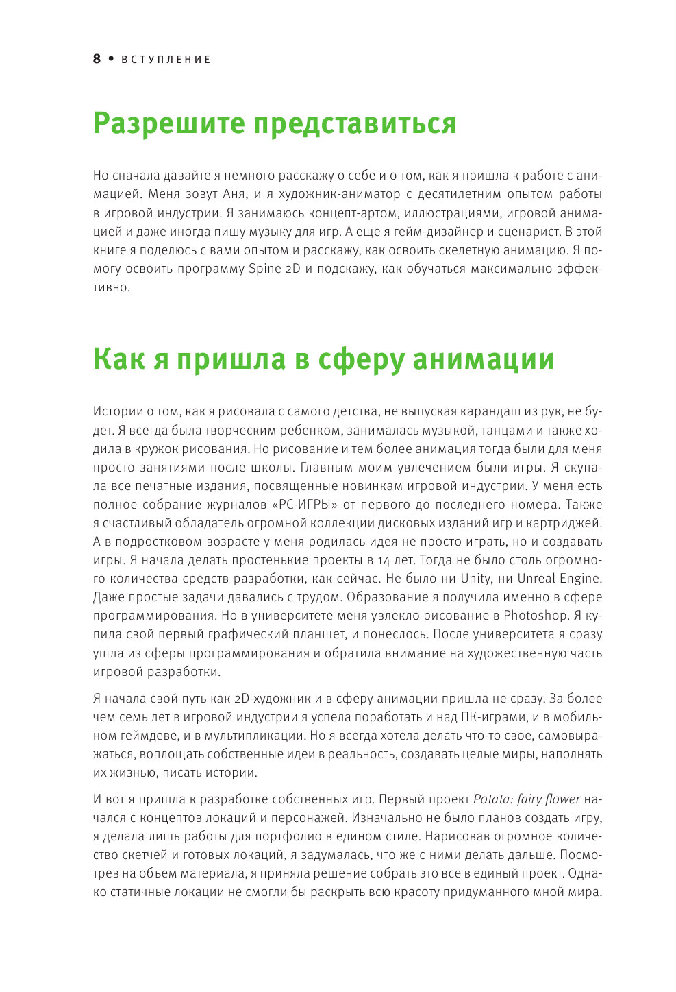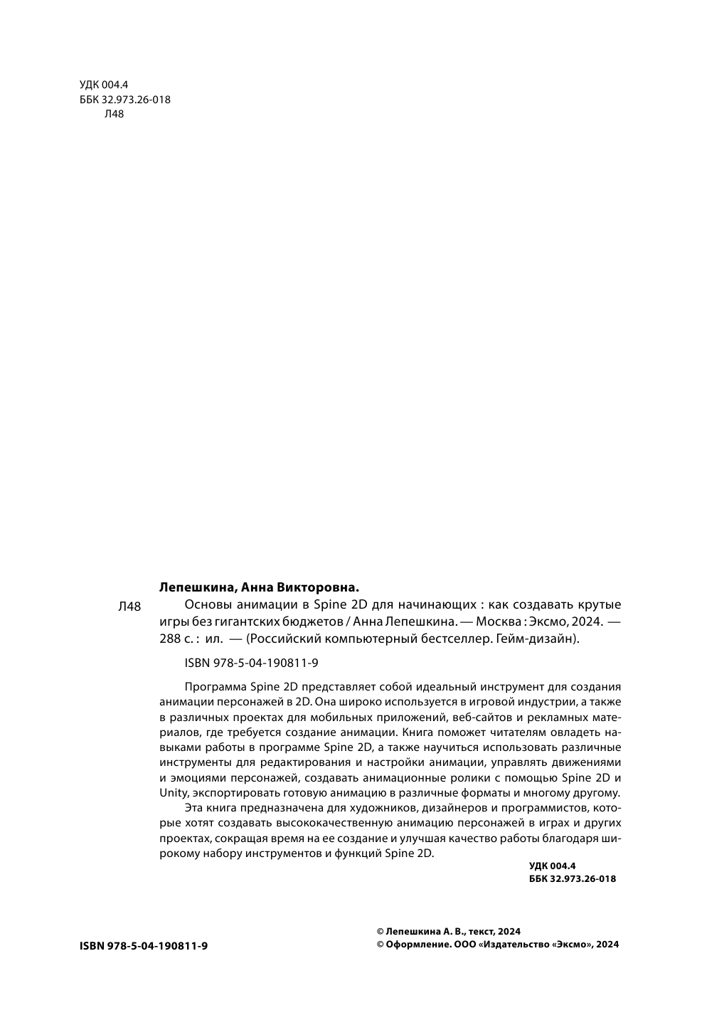 Spine 2D — это программа для создания анимации персонажей в 2D. Она используется в игровой индустрии, а также в различных проектах для мобильных приложений, веб-сайтов и рекламных материалов, где требуется создание анимации. Хотите своими руками создавать крутую анимацию в играх? Тогда эта книга — именно то, что вам нужно! С помощью нее вы научитесь: • Работать с программой Spine 2D. • Подготавливать материалы для создания анимации. • Использовать различные инструменты для редактирования и настройки анимации. • Применять скелетную анимацию. • Управлять движениями и эмоциями персонажей. • Создавать анимационные ролики с помощью Spine 2D и Unity. • Экспортировать готовую анимацию в различные форматы и многое другое! Эта книга написана для художников, дизайнеров и программистов, которые хотят создавать высококачественную анимацию персонажей в играх и других проектах. Она поможет вам сократить время на создание анимации и улучшить качество работы благодаря широкому набору инструментов и функций Spine 2D. Анна Лепешкина — художник, гейм-дизайнер, сценарист и аниматор на собственных проектах Potata, Almost my floor. Более 10 лет работала концепт-художником в игровых проектах, анимации и сфере настольных игр. Автор собственных курсов в школе smirnovschool. Одна из основателей студии Potata company.