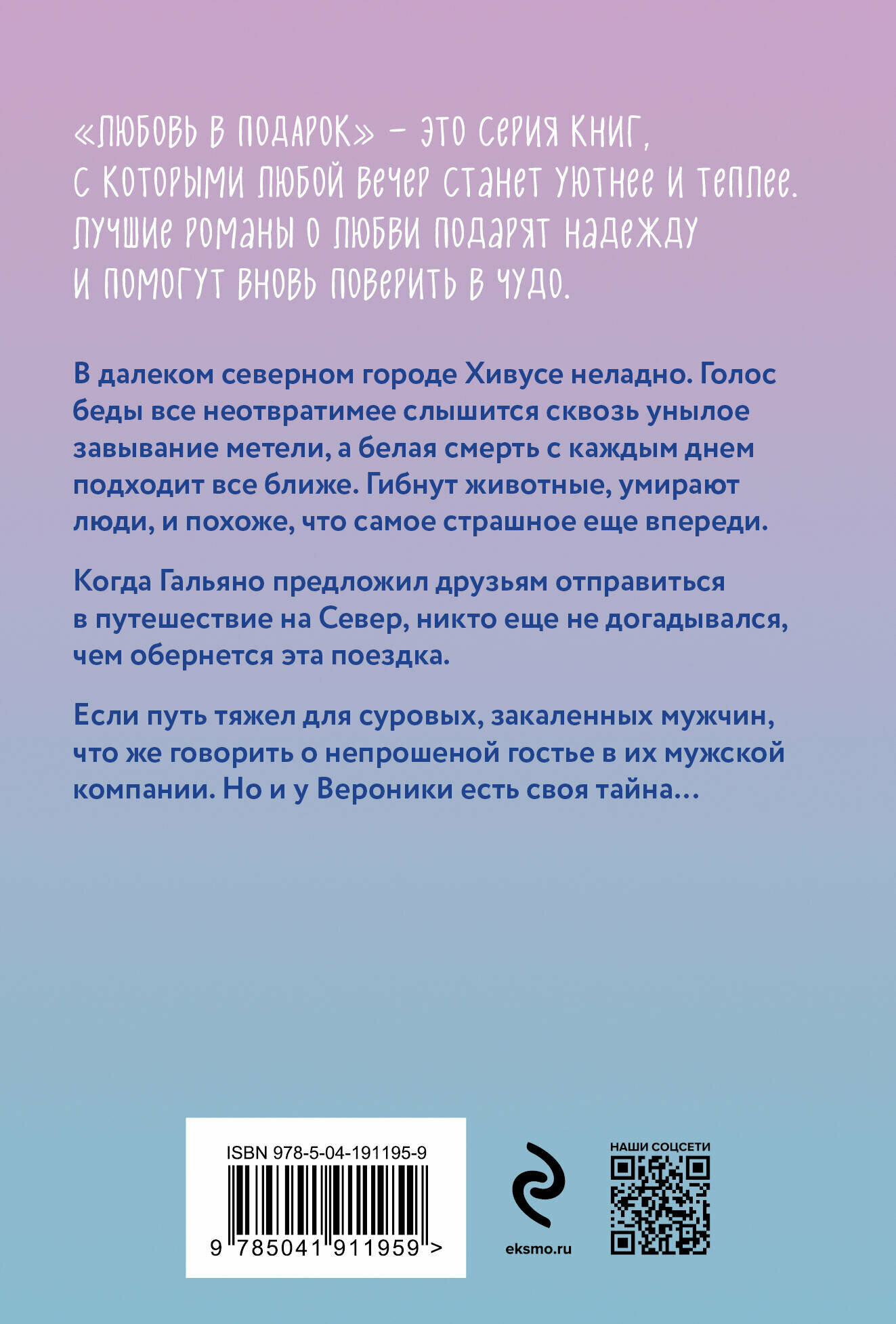 «ЛЮБОВЬ В ПОДАРОК» — это серия книг, с которыми любой вечер станет уютнее и теплее. Лучшие романы о любви, которые подарят надежду и заставят вновь поверить в чудо. В далеком северном городе Хивусе неладно. Голос беды все неотвратимее слышится сквозь унылое завывание метели, а белая смерть с каждым днем подходит все ближе. Гибнут животные, умирают люди, и похоже, что самое страшное еще впереди. Когда Гальяно предложил друзьям отправиться в путешествие на север, никто еще не догадывался, чем обернется эта поездка. Если путь тяжел для суровых закаленных мужчин, что же говорить о непрошеной гостье в их мужской компании. Но и у Вероники есть своя тайна…