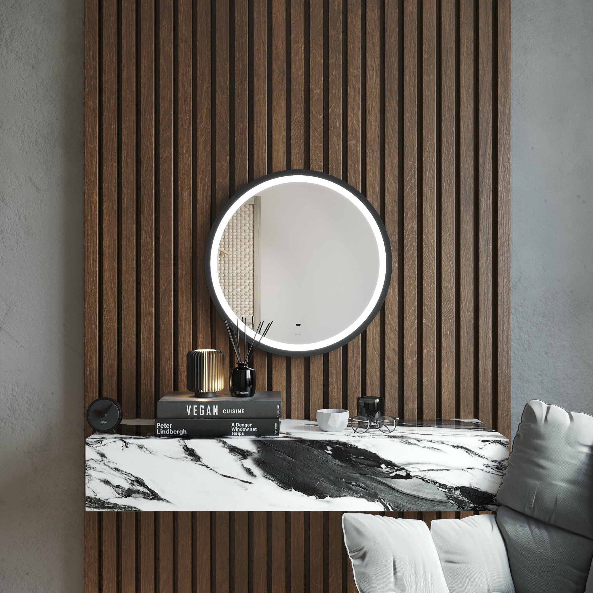 Дизайнерское зеркало в лофт стиле круглое 60х60см с LED подсветкой BOND Circle M60ZE-6060 очень стильно выглядит и круто смотрится в современном интерьере. Оно изготовлено из высококачественных комплектующих от мировых производителей и имеет влагостойкое зеркальное полотно AGC премиум толщиной 4мм европейского производства по стандарту IP 44. Яркость обеспечивает установленная с фронтальной стороны светодиодная LED лента. Расположенный по всему периметру черный кант прекрасно воплощает в изделии суперсовременный лофт стиль и делает его роскошным. Зеркало оснащено бесконтактным сенсорным выключателем с диммером, с помощью которого можно включать и регулировать мощность освещения, просто взмахнув рукой и не оставляя отпечатков на зеркале. С тыльной стороны находятся удобное крепления для установки и шнур с вилкой для включения в розетку. Зеркало прекрасно сочетается с различными стилями интерьера и будет радовать Вас долгие годы.