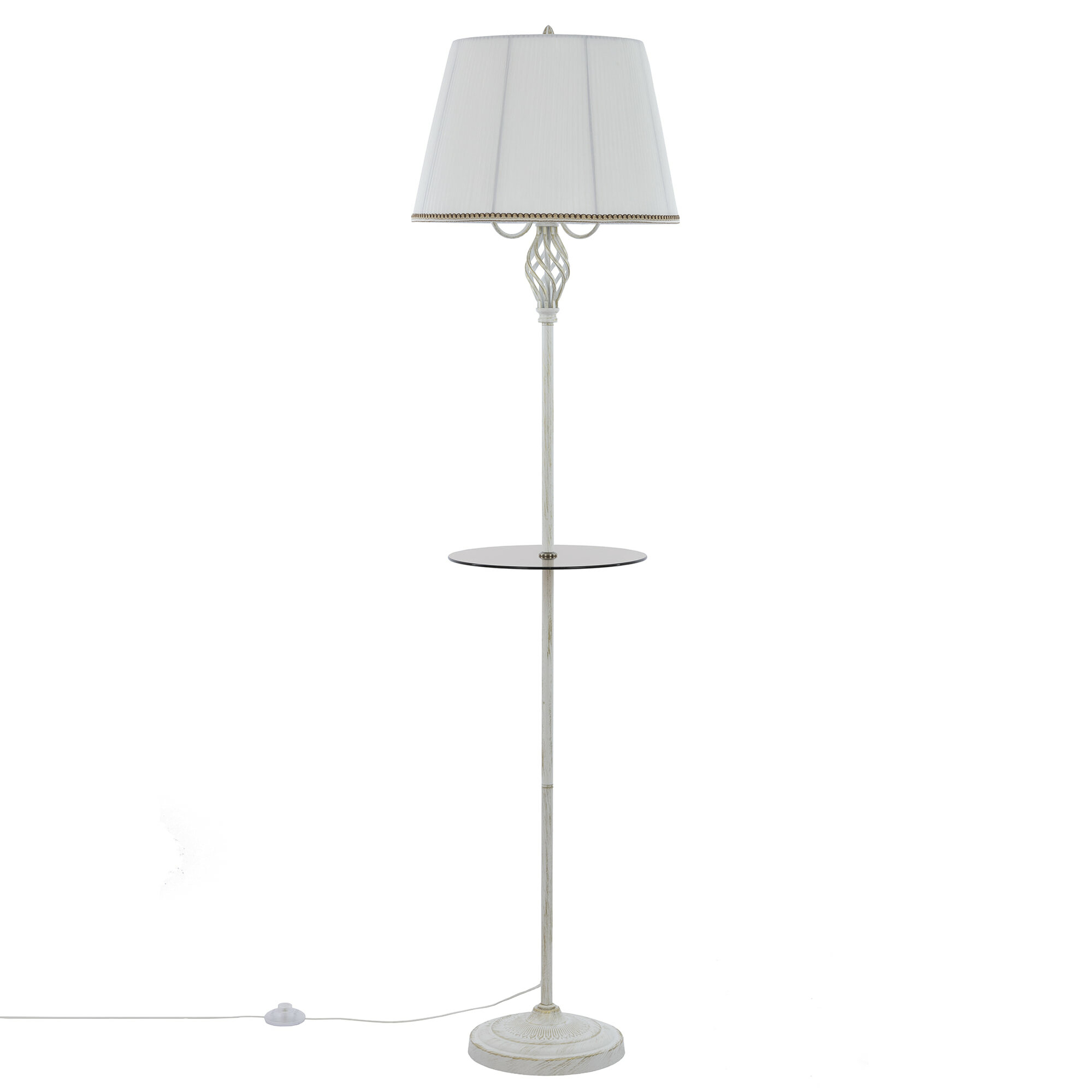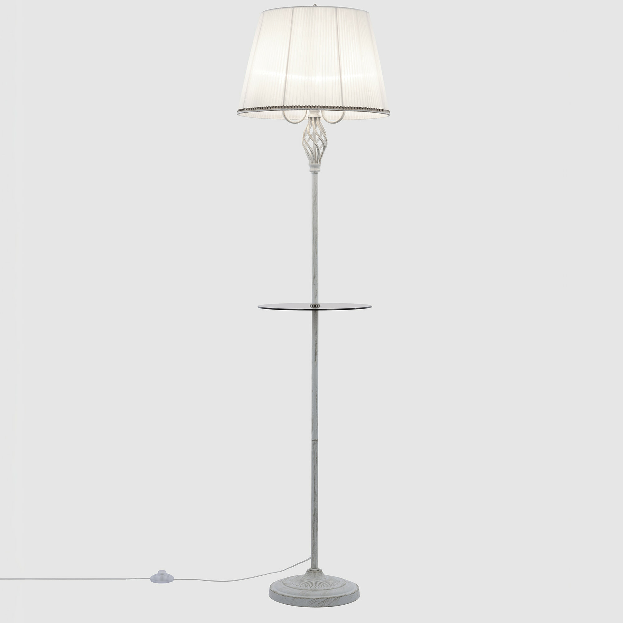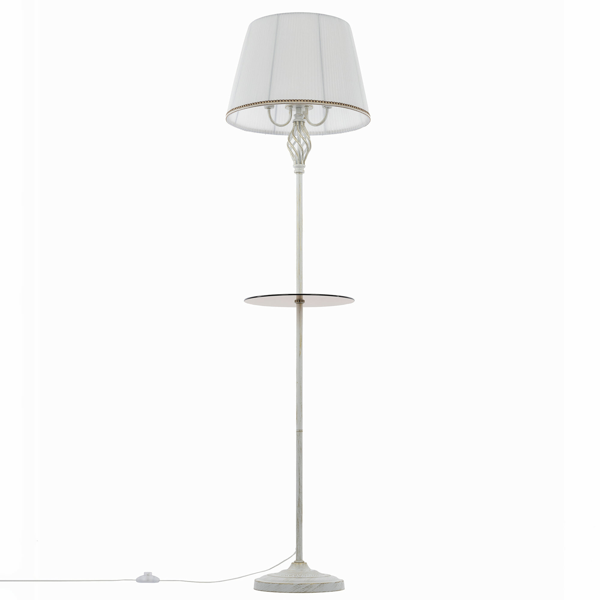 Элегантный торшер со столиком Citilux Вена CL402920T выполнен в классическом стиле. Корпус металлический, белого цвета с благородной золотистой патиной. Устойчивое основание украшено искусным орнаментом, верхняя часть стойки с красивым витым декоративным элементом. Тканевый абажур из белой плиссированной полупрозрачной органзы окантован изящной тесьмой. Удобный круглый столик изготовлен из закалённого тонированного стекла.