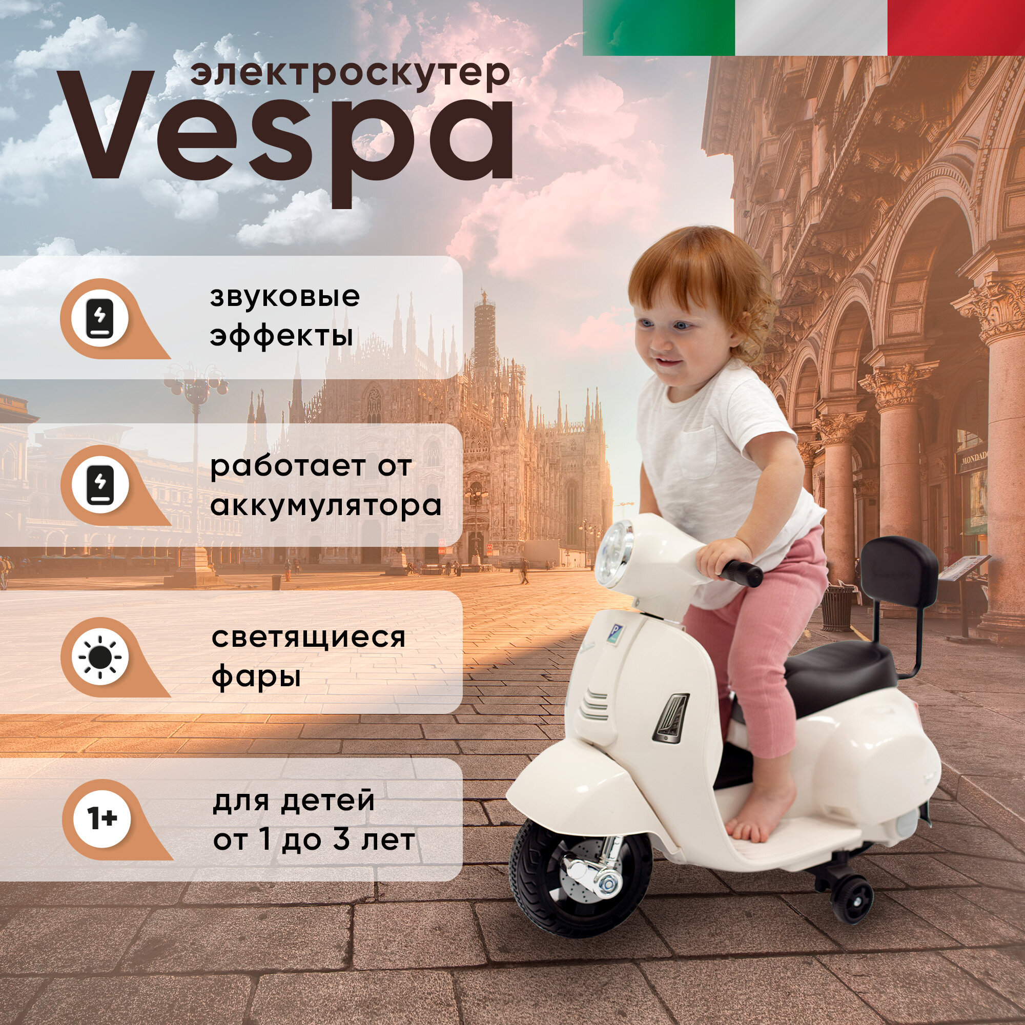 Аккумуляторная электрокаталка/электроскутер Sweet Baby Vespa - ваш надежный компаньон для веселой и безопасной езды для детей! Эта каталка обладает всеми необходимыми функциями, чтобы сделать дни вашего ребенка яркими и увлекательными. Рассчитана для детей от 1 до 3 лет.