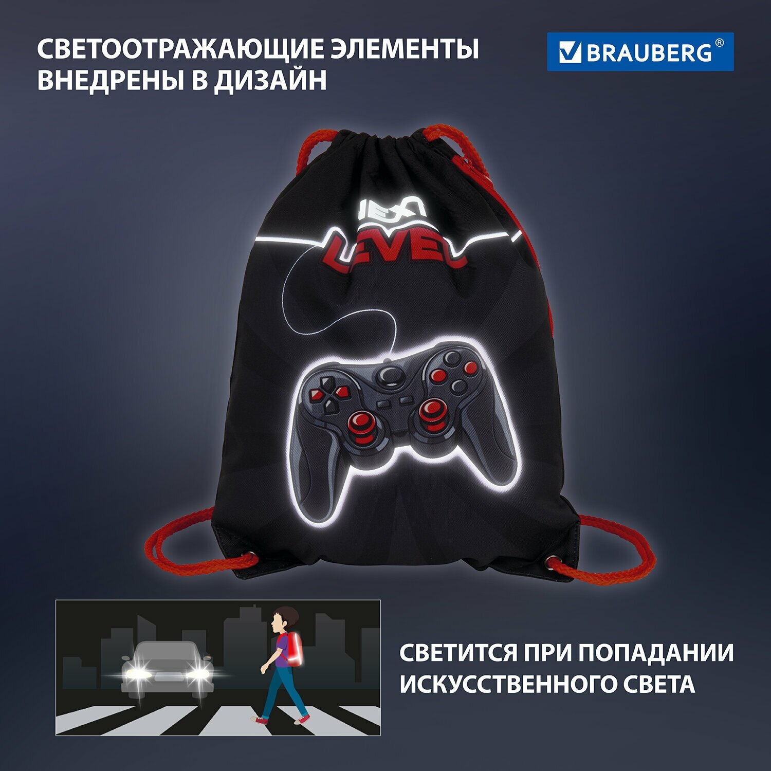 Brauberg - необходимый аксессуар в школе. Особенности: Подходит как для обуви, так и для физкультурной формы и сменной одежды для факультативных занятий. Затягивается двумя шнурками. Можно носить на плечах за спиной. Изготовлен из плотного полиэстера с водоотталкивающей пропиткой. Яркая и четкая печать дизайна на товаре достигнута за счет использования высококачественной ткани с высокой плотностью. Мешок размером 43х33 см имеет одно вместительное отделение с подкладкой и боковой карман на молнии для телефона, ключей и других мелочей. Наличие светоотражающих элементов в дизайне мешка повышает безопасность ребенка в темное время суток. Мешок для обуви упакован в плотный ПЭТ пакет, который сохранит качество и товарный вид при хранении и транспортировке.