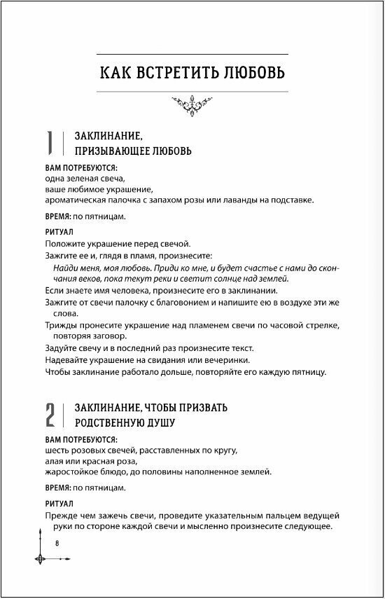 Каждое заклинание подробно описано. Вы узнаете, когда лучше всего исполнять тот или иной ритуал, какие атрибуты использовать, что делать, чтобы заклинание работало как можно дольше, — что ценно и для новичков, и для магов-профессионалов. А большинство ингредиентов для ритуалов вы легко найдете в кухонном шкафчике, саду, супермаркете или в интернете.