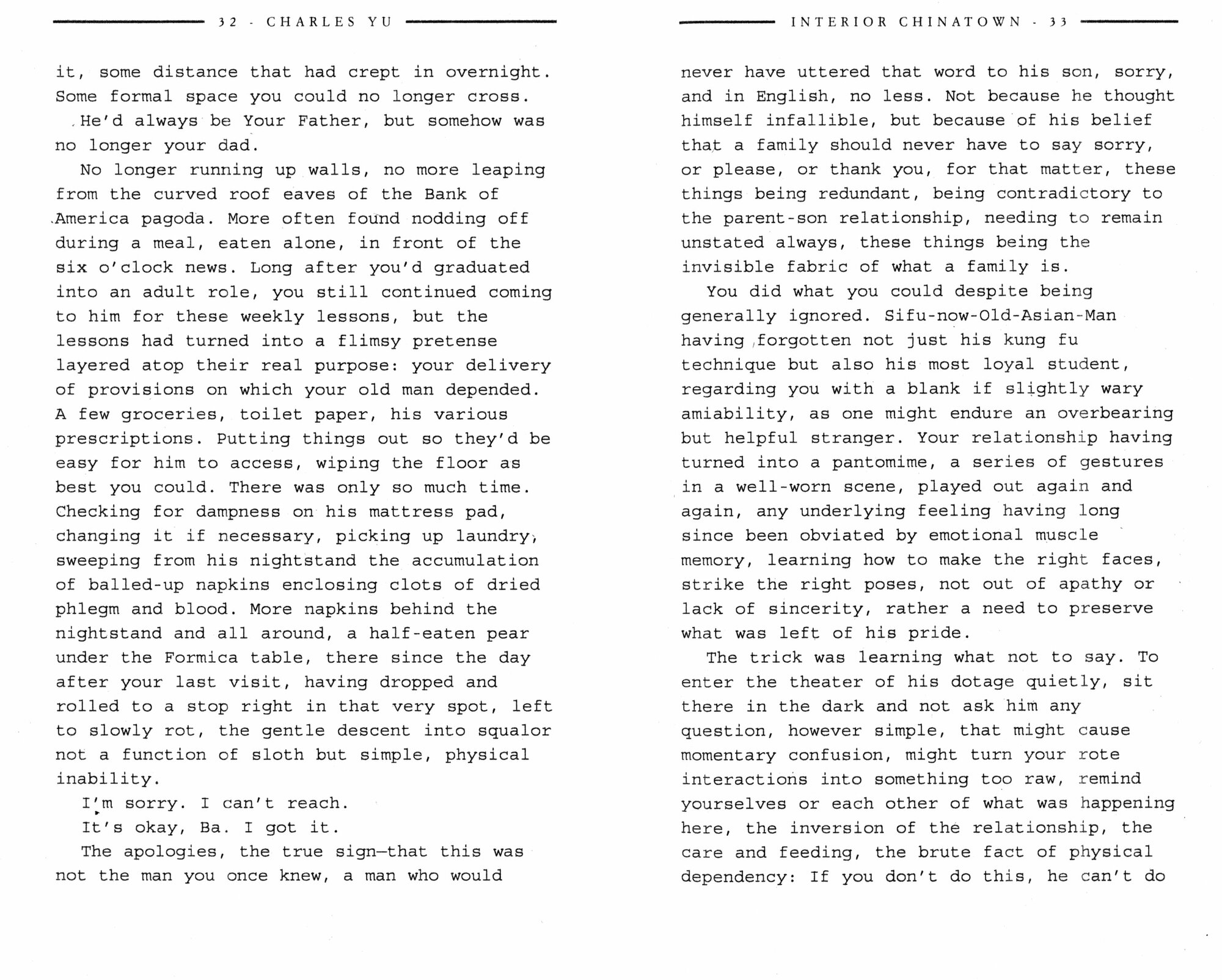 Willis Wu doesn’t perceive himself as a protagonist even in his own life: He’s merely Generic Asian man. Sometimes he gets to be Background Oriental Making a Weird Face or even Disgraced Son, but he is always relegated to a prop. Yet every day he leaves his tiny room and enters the Golden Palace restaurant, where Black and White, a procedural cop show, is in perpetual production. He’s a bit player here, too, but he dreams of being Kung Fu Guy—the most respected role that anyone who looks like him can attain. At least that’s what he has been told, time and time again. Except by one person, his mother. Who says to him: Be more.
