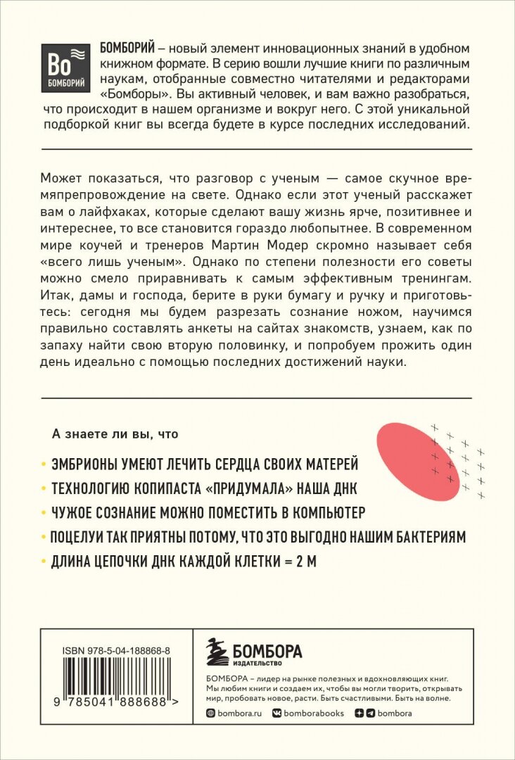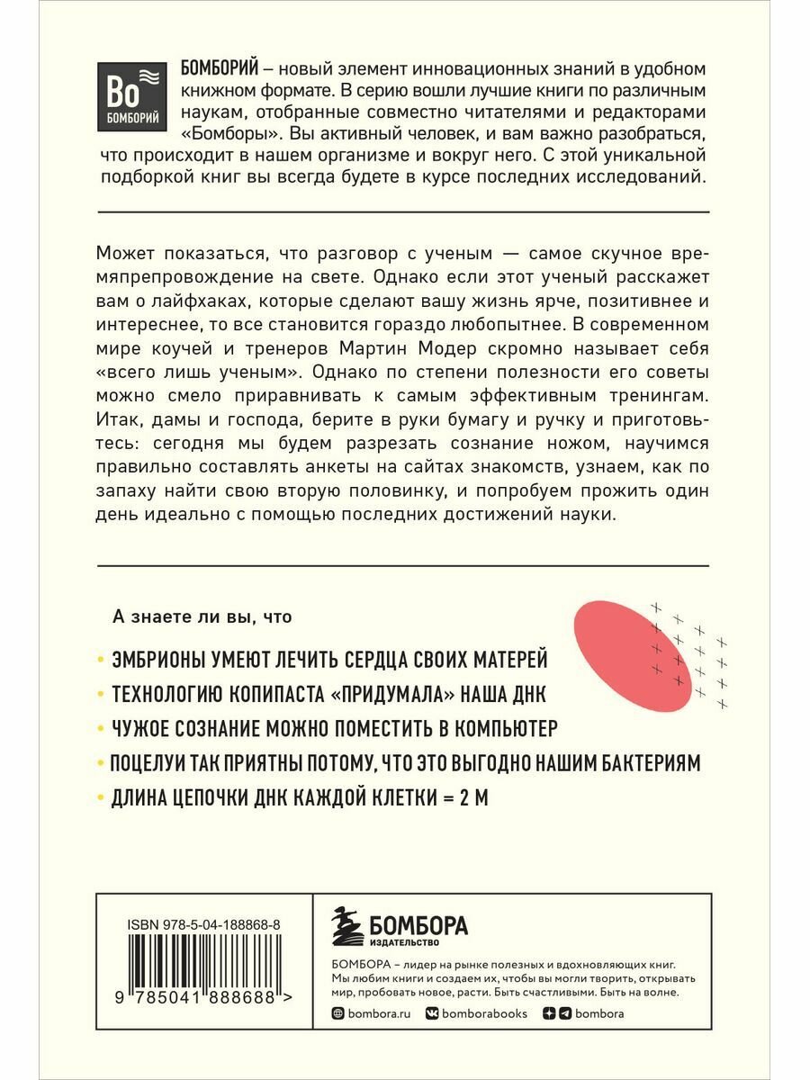 С помощью этой книги Мартин Модер заражает читателя любовью к науке, экспериментам и фактам. Он привлекает генетику, биологию и медицину к решению повседневных проблем и делится необычными, но действенными лайфхаками. Вы узнаете, сколько съесть хлеба, чтобы получить легкую степень опьянения, как победить простуду при помощи обнимашек и как старые носки могут спасти жизнь.