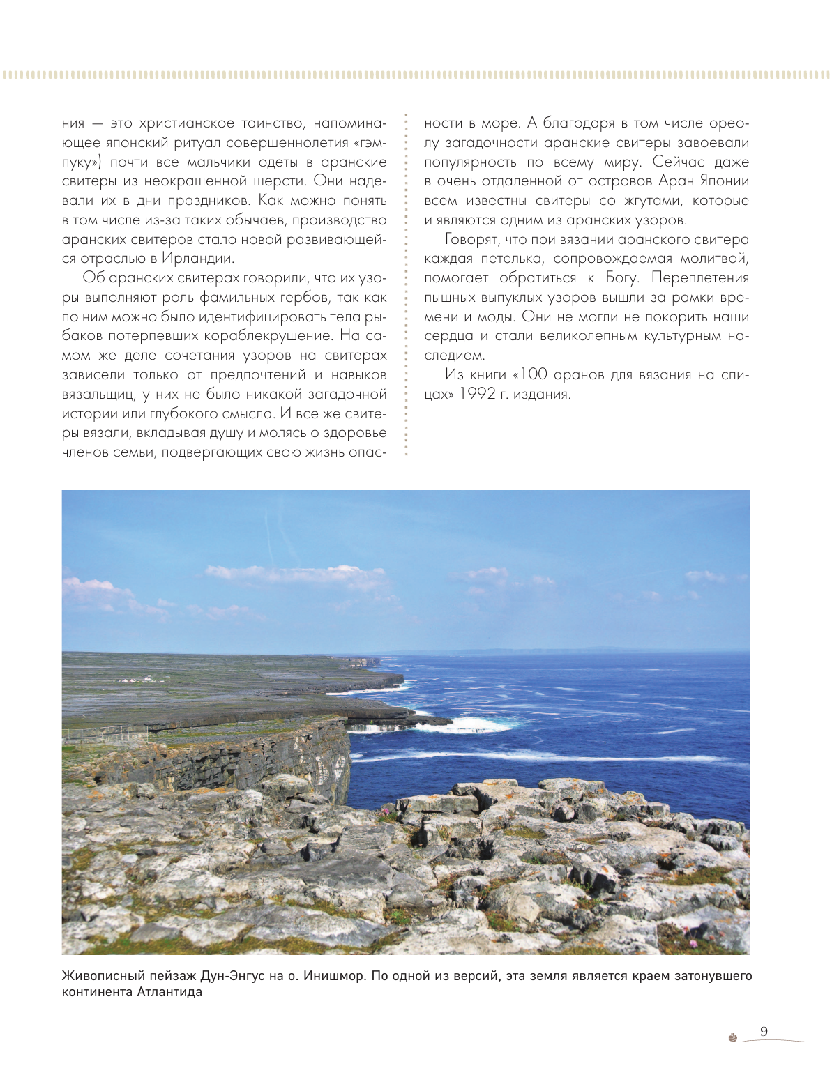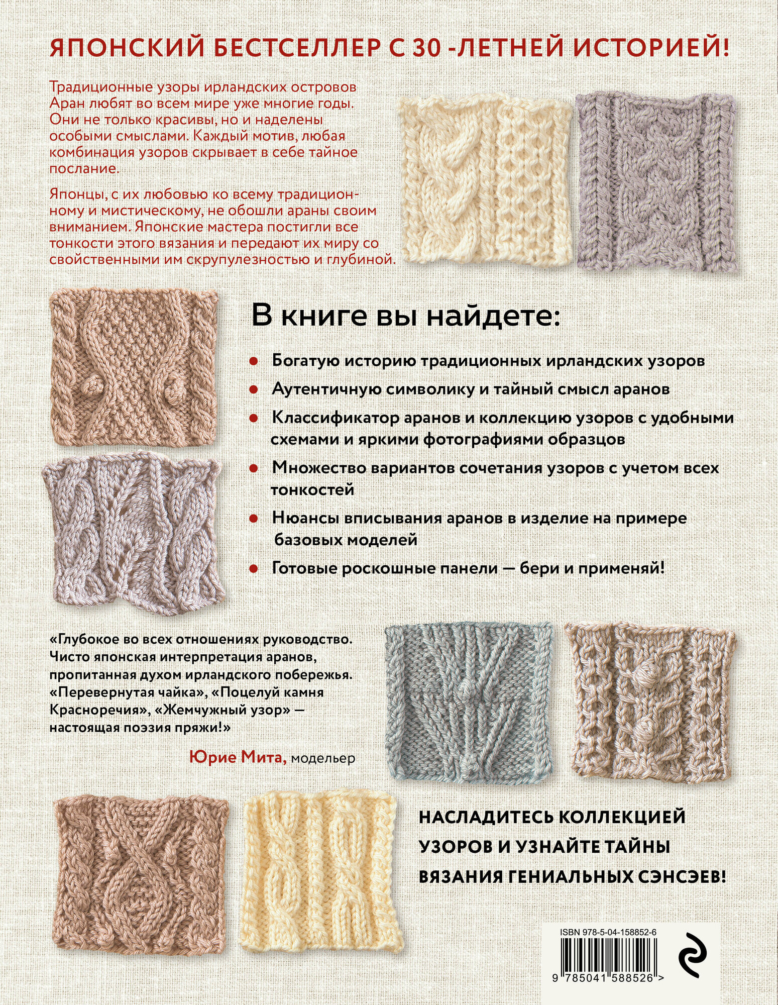 «Глубокое во всех отношениях руководство. Чисто японская интерпретация аранов, пропитанная духом ирландского побережья. "Перевернутая чайка", "Поцелуй камня Красноречия", "Жемчужный узор" — настоящая поэзия пряжи!» — Юрие Мита, модельер