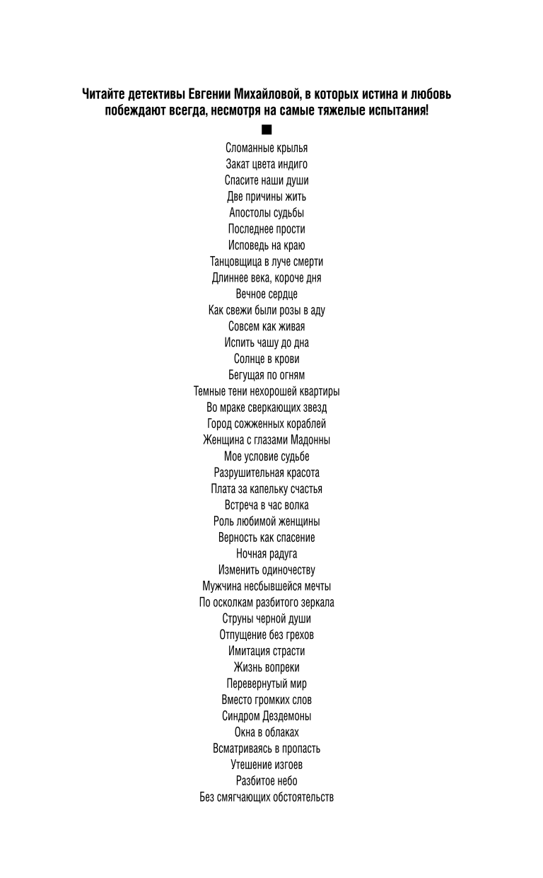 Героини остросюжетных рассказов Евгении Михайловой по-разному понимают справедливость, но готовы ради нее и на преступления, и на подвиги. Им приходится столкнуться с подлостью и предательством самых близких людей, но они, несмотря ни на что, находят в себе душевные силы противостоять злу и выйти из схватки с ним победителями. Герои этих новелл — обычные люди, они беспомощны, беззащитны и поодиночке пропадут, но могут помочь друг другу в схватке с несправедливостью.