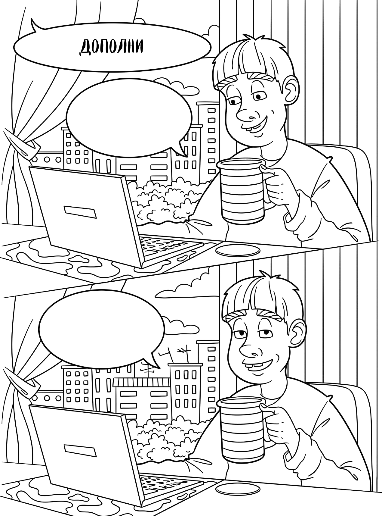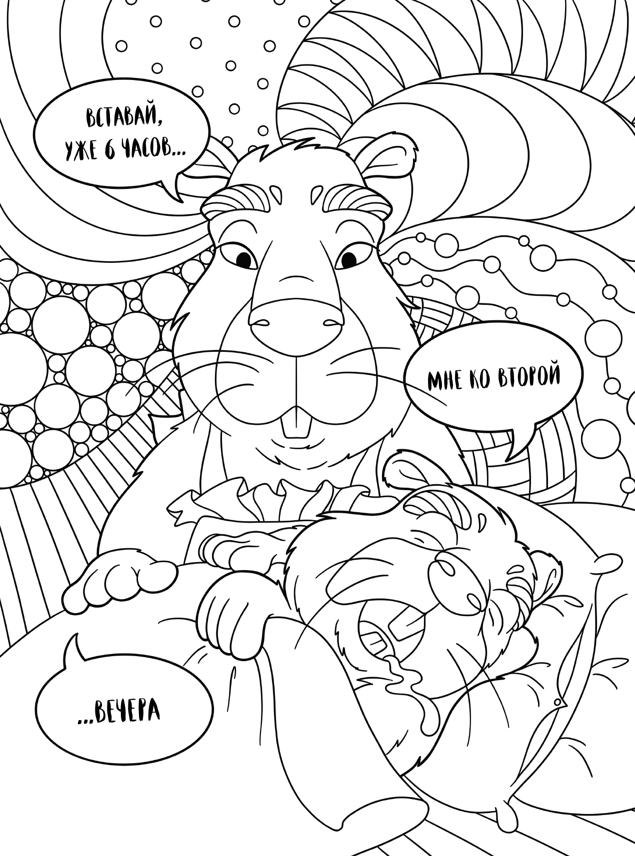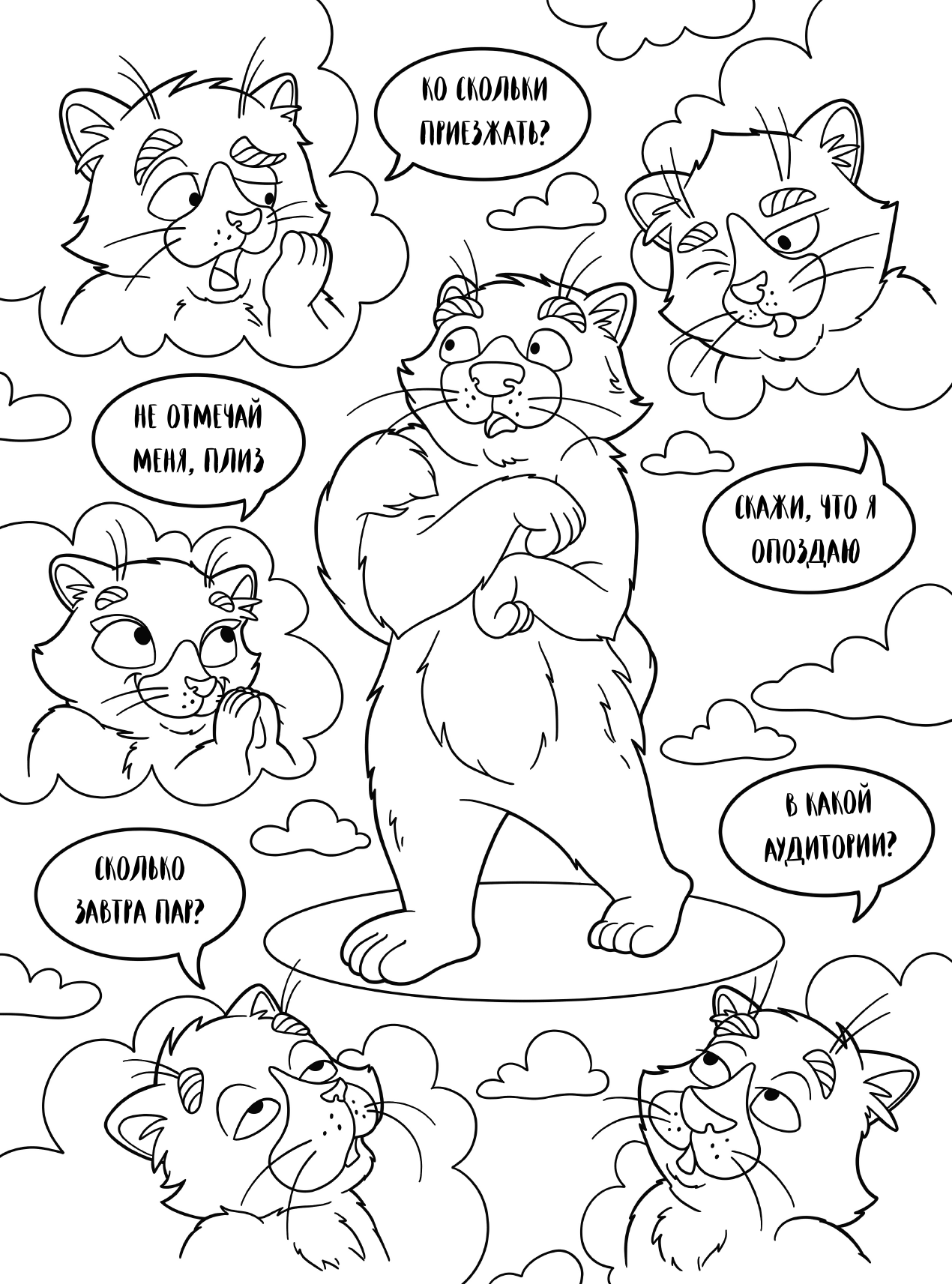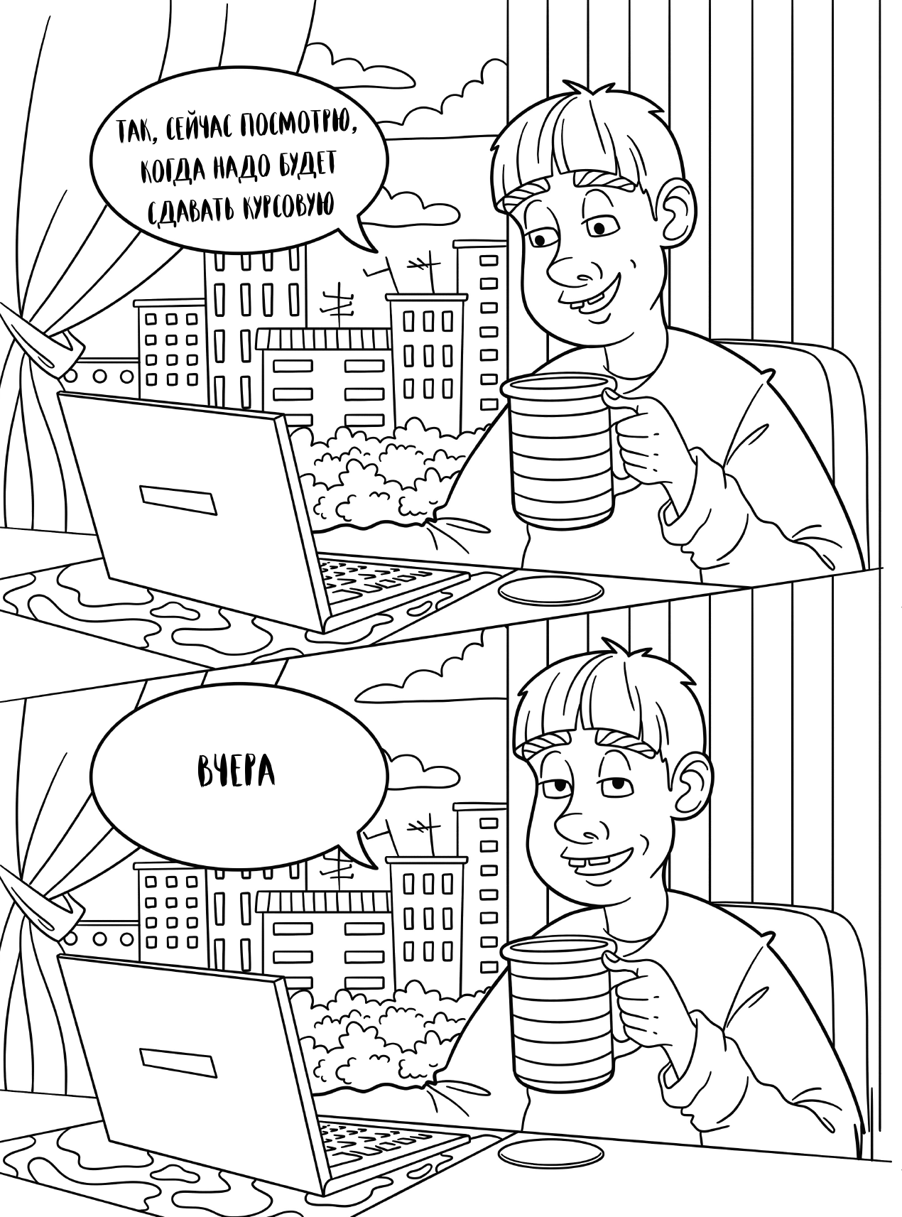 Перед тобой необычная раскраска-антистресс! Если тебя достали однокурсники и хочется расслабиться после учебного дня, то эта раскраска прекрасно подойдет! Возьми свои любимые карандаши или цветные ручки, найди мем, наиболее полно описывающий твое состояние, и выплесни свои эмоции! Отвлекись от внешнего мира, раскрашивая капибар и обезьянок в жизненных ситуациях из известных мемов!