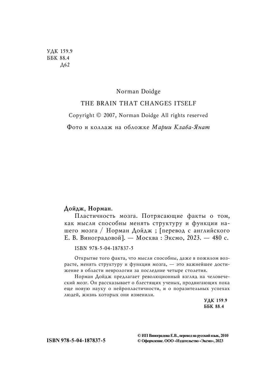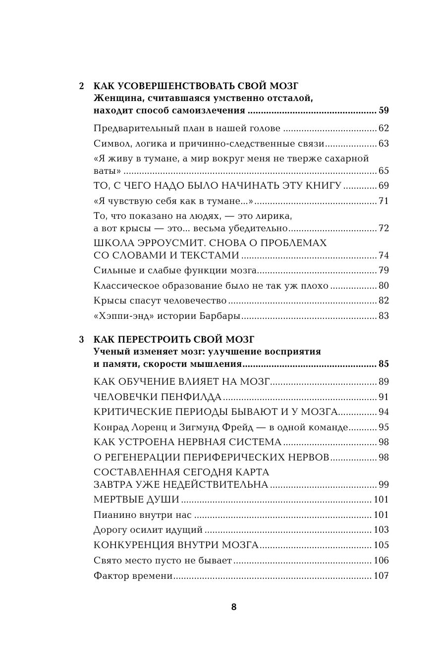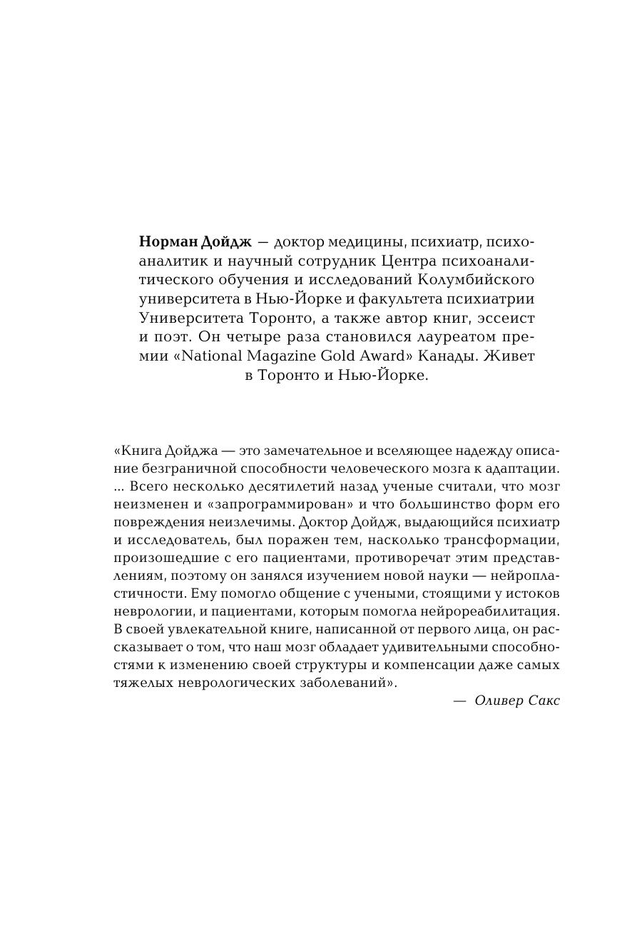 Эта книга рассказывает о революционном открытии в области изучения человеческого мозга, доказывающем его способность к самоизменению. В ней представлены истории об ученых, врачах и пациентах, которые смогли добиться удивительных трансформаций. Всем им удалось, без оперативного вмешательства или применения медикаментов, использовать ранее не известную способность мозга к изменениям. Открытие того, что мозг способен менять собственную структуру и функционирование благодаря мыслям и действиям человека, — самое важное нововведение в наших представлениях о человеческом мозге начиная с тех пор, как впервые была обрисована в общих чертах его анатомия и работа основной структурной единицы — нейрона.