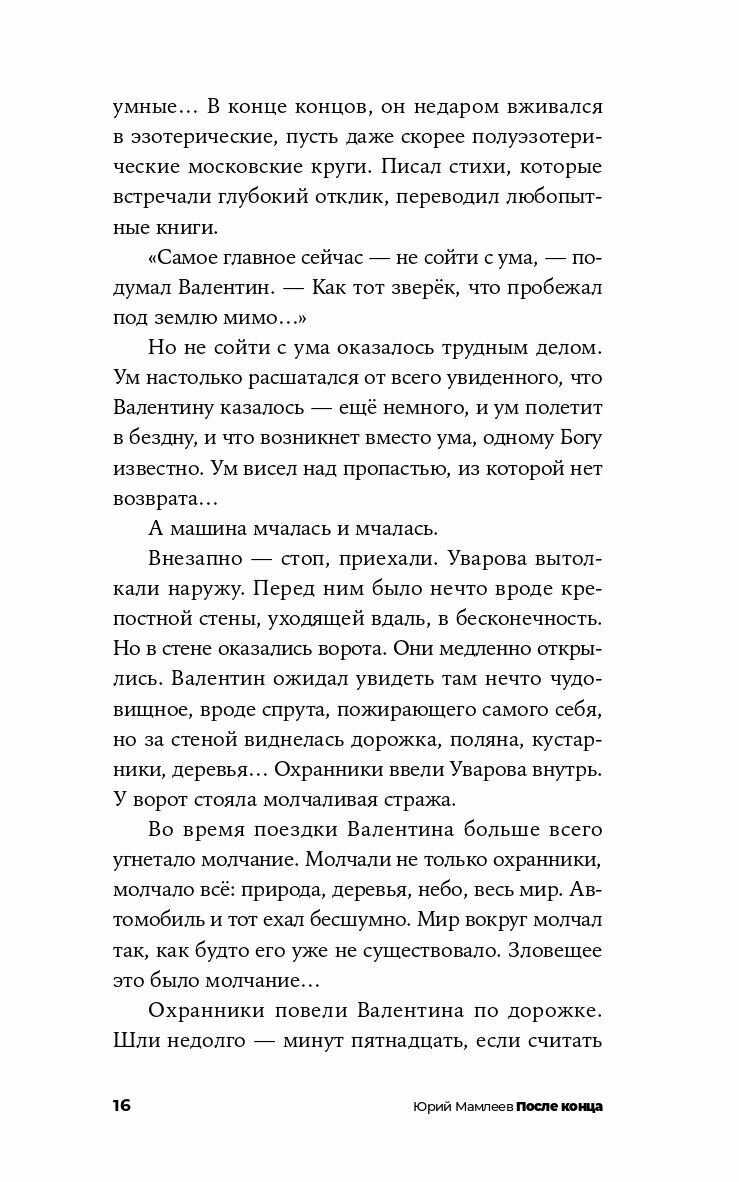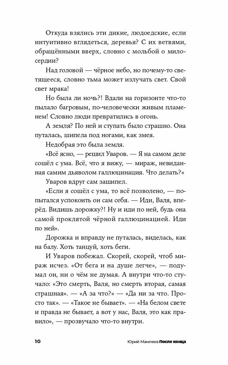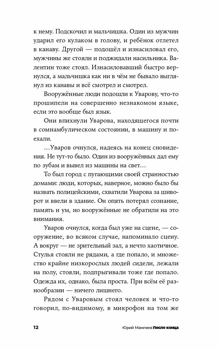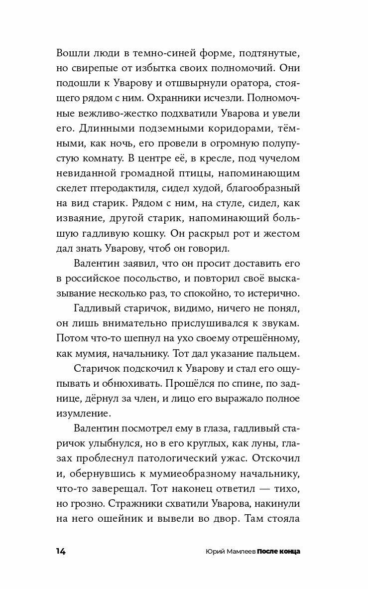 «После конца» — антиутопия, посвящённая антропологической катастрофе. Всё в фантастическом безумном мире доведено до абсурда. Русская готика Мамлеева не боится аллюзий. Мы проходим круг за кругом нового ада, и там, за поворотом сюжета, автор в милосердной молитве просит Создателя помиловать отпавшее человечество. Может быть, и тщетно…