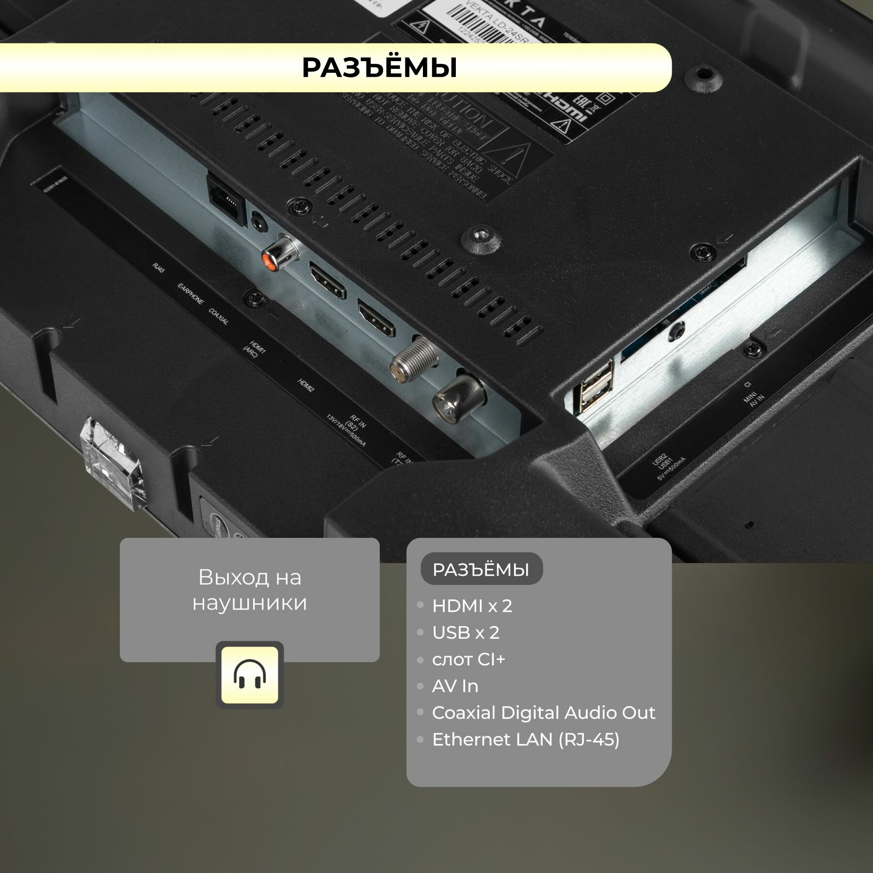 Одной из особенностей этой модели является наличие встроенных тюнеров DVB-T/T2 и DVB-C, что позволяет просматривать цифровые и кабельные каналы без необходимости использования дополнительных ТВ-приставок. Также в телевизоре есть встроенный тюнер DVB-S2 и CI слот для просмотра спутниковых каналов с помощью карты провайдера и САМ модуля.