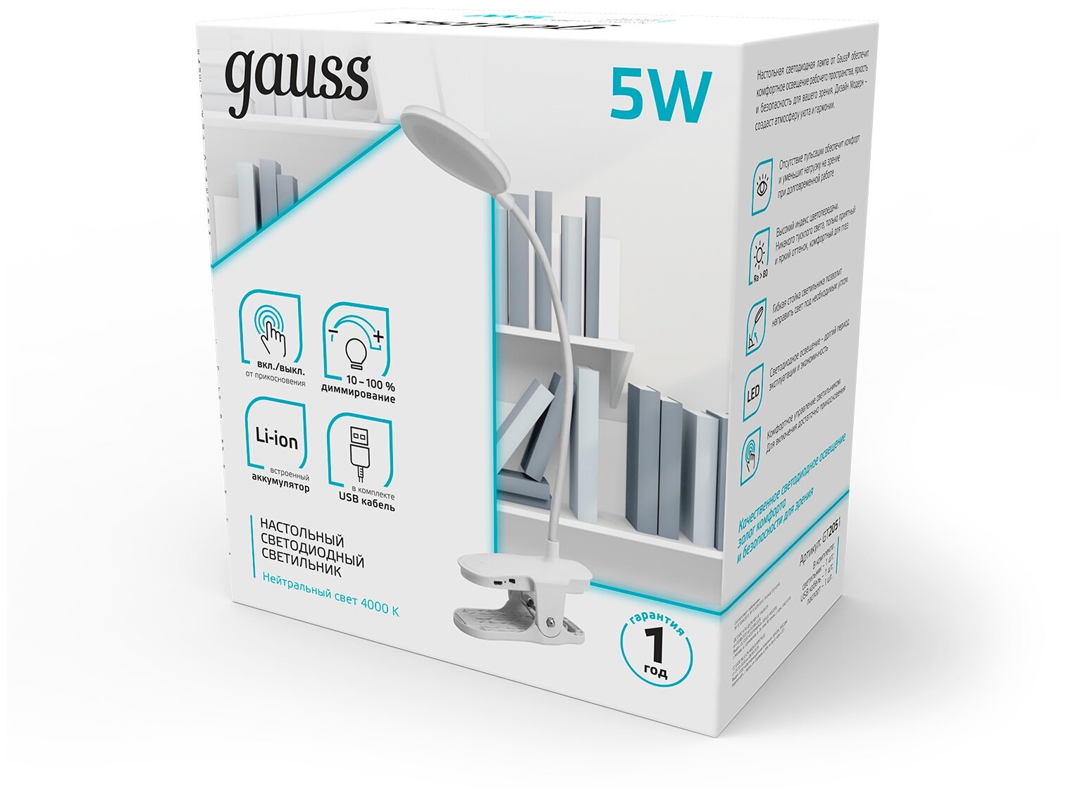 Аккумуляторный диммируемый светильник от Gauss станет для вас незаменимым помощником. Данный источник света не требует замены батареек, он светит в течение длительного времени до следующей подзарядки, а также легко заряжается. Аккумулятор Li-ion большой запас емкости и легкий вес. Потребляемая мощность 5 Вт, без мерцания, цветовая температура 4000 К - все эти параметры благоприятно влияют на работоспособность глаз во время чтения или работы. Сенсорная регулировка уровня яркости позволяет легко выбрать необходимый цвет освещения для работы, чтения, обучения или отдыха. Светильник представлен в чёрном и белом цвете, выполнен в лаконичным стиле, что подойдёт для любого интерьера. Настольная лампа от Gauss на прищепке оснащена встроенным аккумулятором. Модели на батарейках - простое практичное и бюджетное решение.