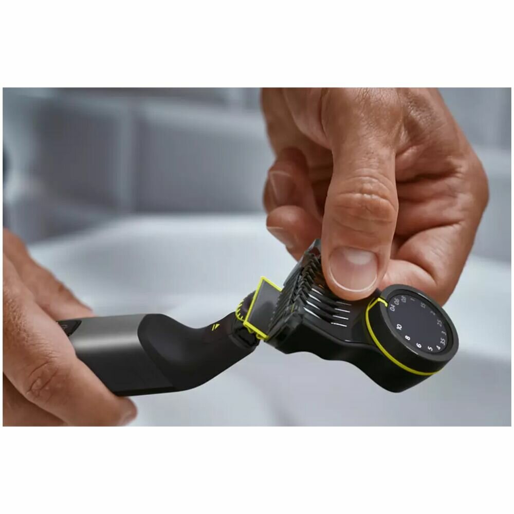 Устройство оснащено быстро движущимся лезвием, которое генерирует до 12000 движений в минуту. При этом он обеспечивает эффективное действие даже для более длинных волос. С помощью Philips OneBlade QP6551 / 15 вы обрезаете волосы на лице до нужной длины благодаря регулируемому прецизионному колпачку. Выберите одну из 14 заблокированных настроек в диапазоне от 0,4 мм до 10 мм, чтобы создать эффект дневной бороды, короткой или длинной бороды.