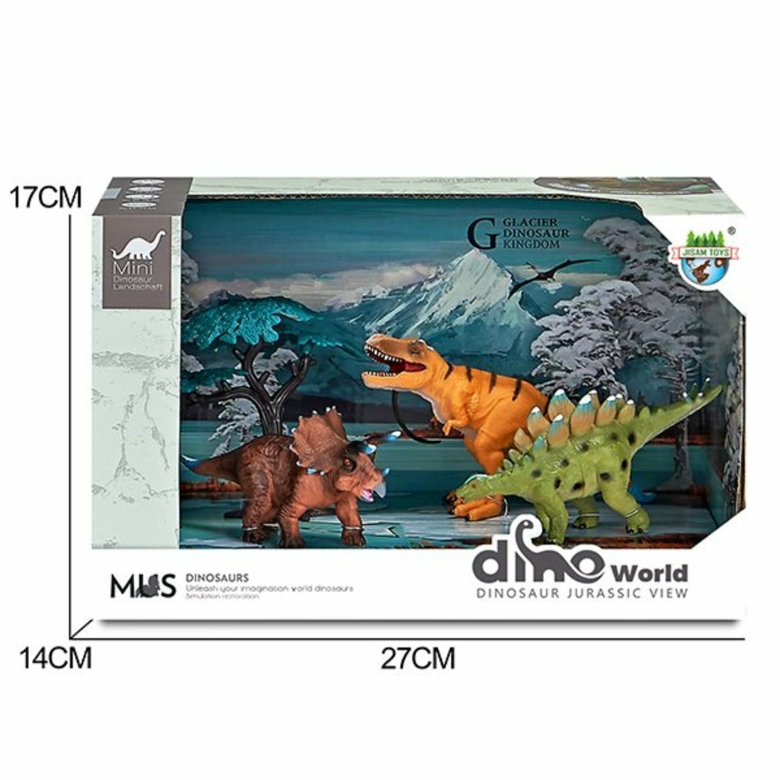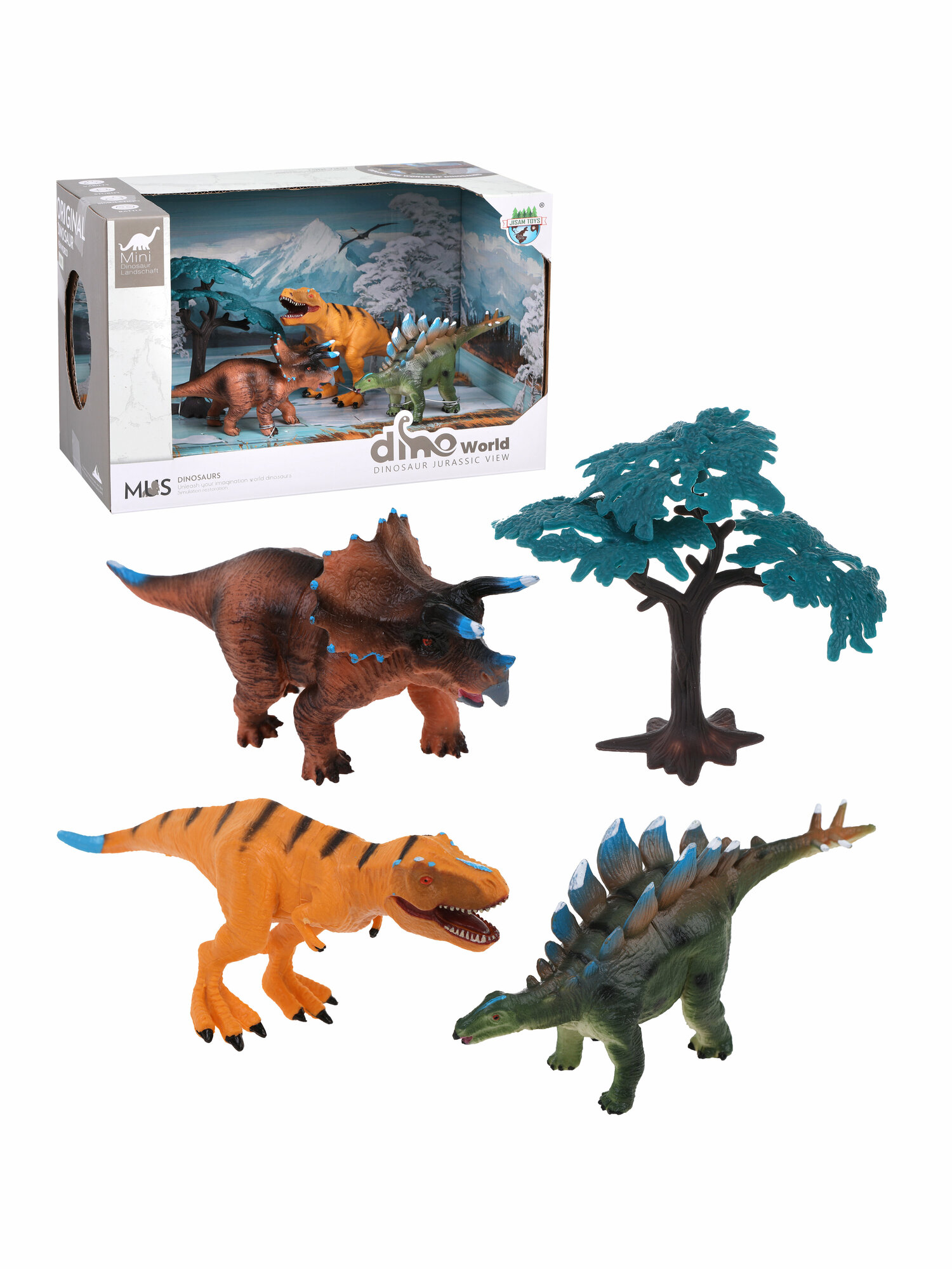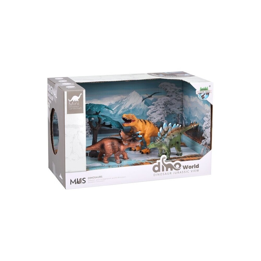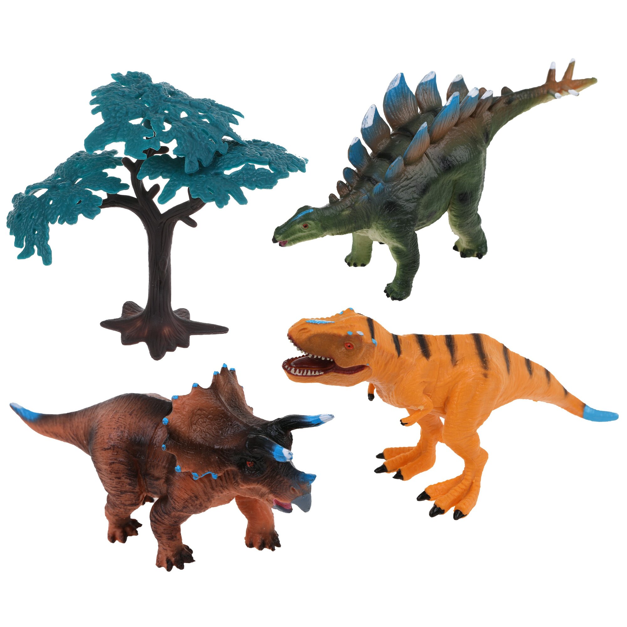 Набор включает в себя 3 фигурки динозавров, разные по цвету, форме и размеру и дерево.