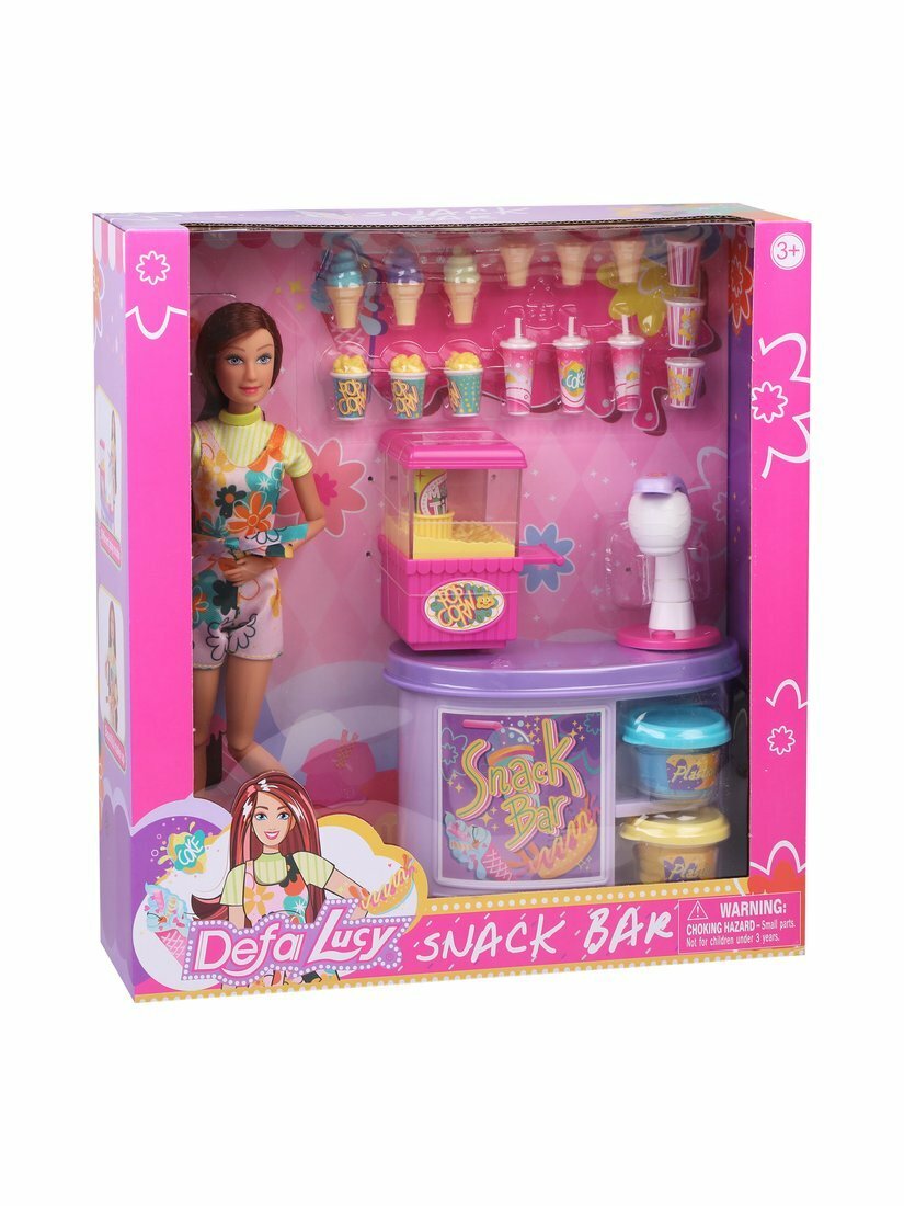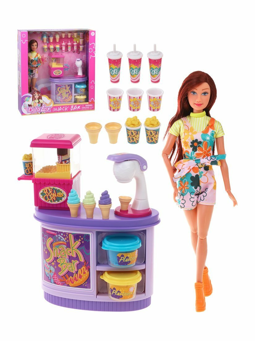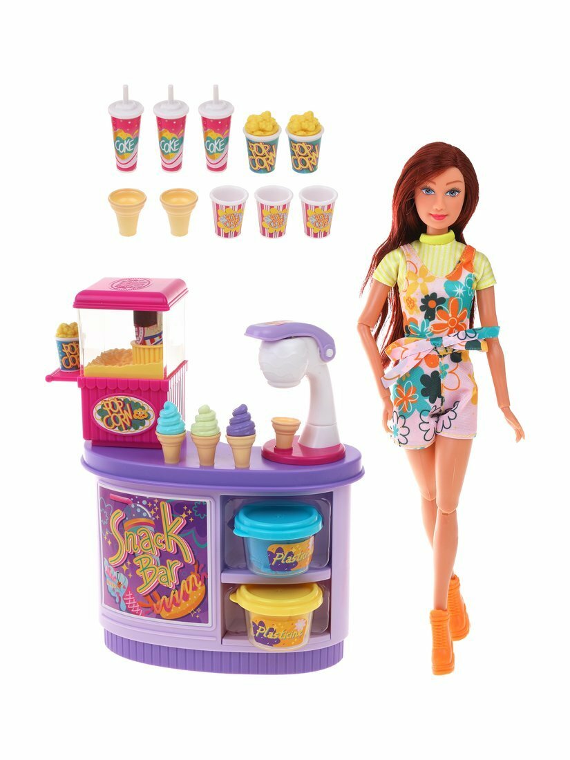 В комплект входят: кукла, торговый прилавок, аппарат для приготовления попкорна, 3 стаканчика «кола», 3 попкорна, 6 стаканчиков для попкорна, 3 мороженых, 6 стаканчиков под мороженое, 2 баночки с пластилином, аппарат для изготовления мороженого из пластилина.