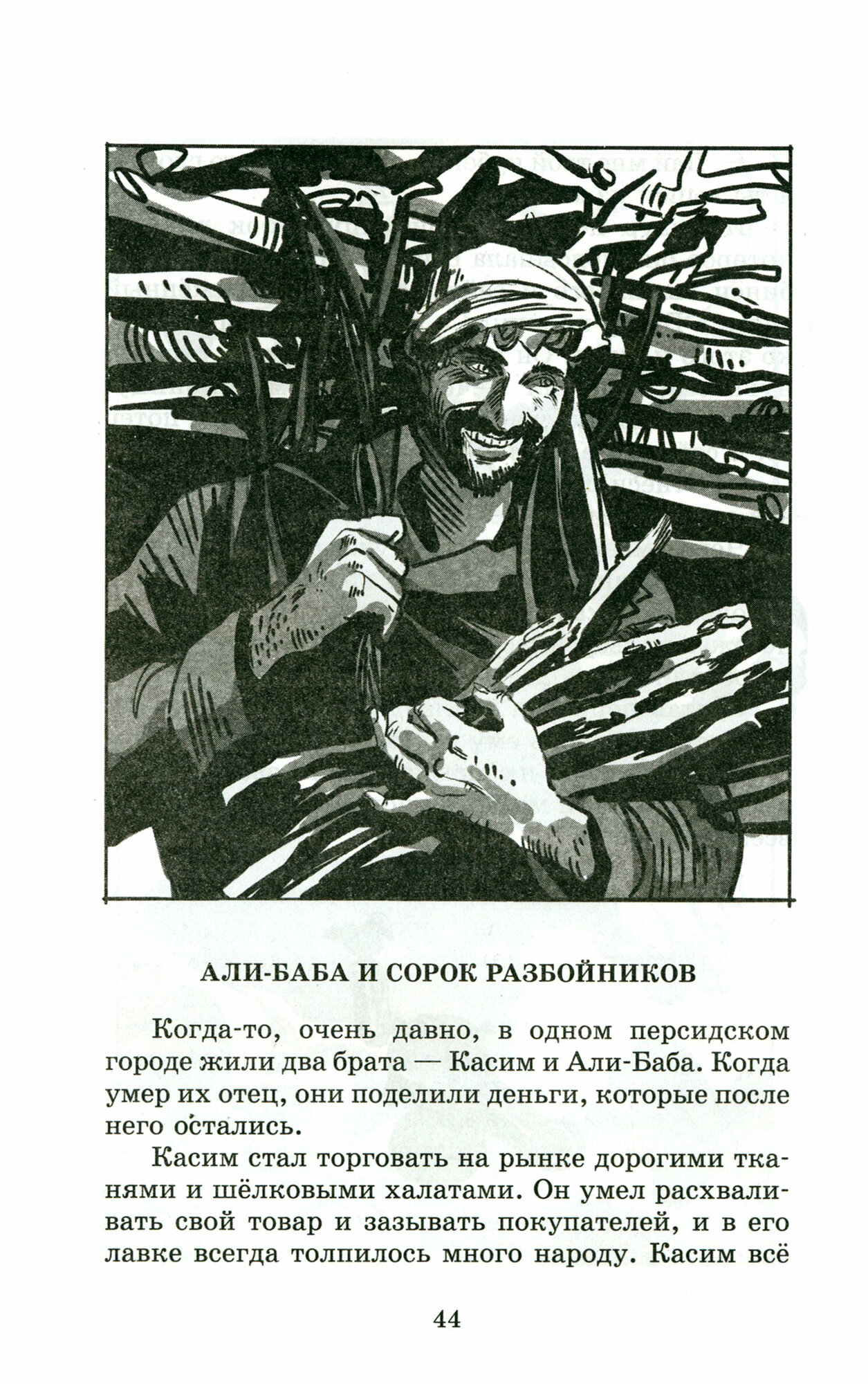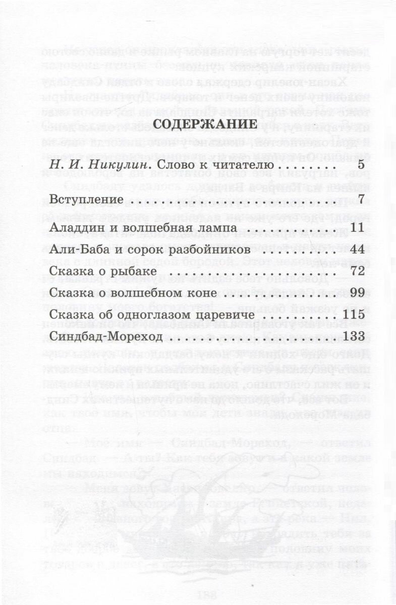 В книгу вошли всемирно известные сказки из арабского сборника "Тысяча и одна ночь": о Синдбаде-Мореходе, об Аладдине и волшебной лампе, об Али-Бабе и сорока разбойниках и другие, которые умная и смелая Шахразада складно, с большим искусством и красноречием рассказывала жестокому царю Шахрияру.