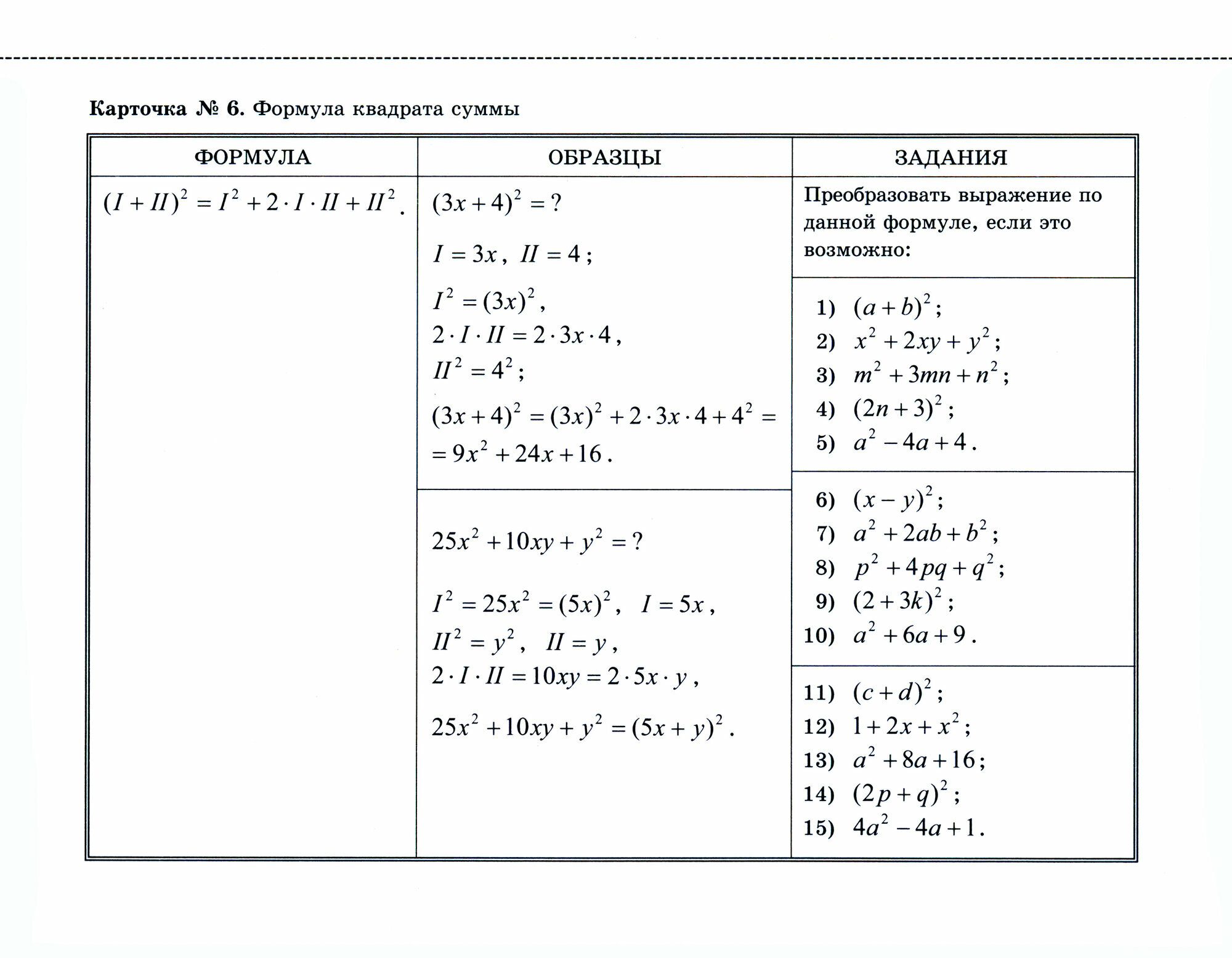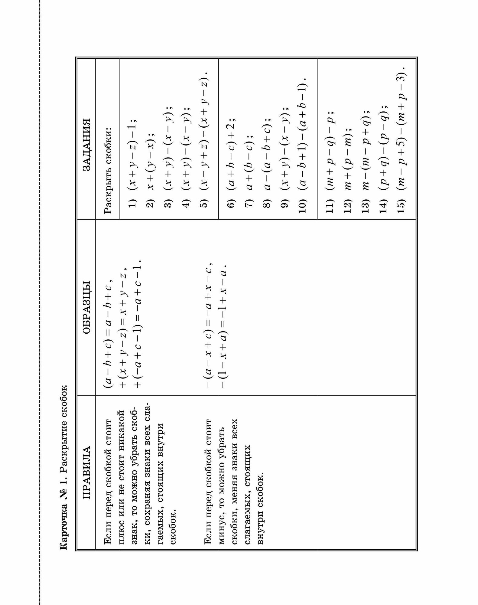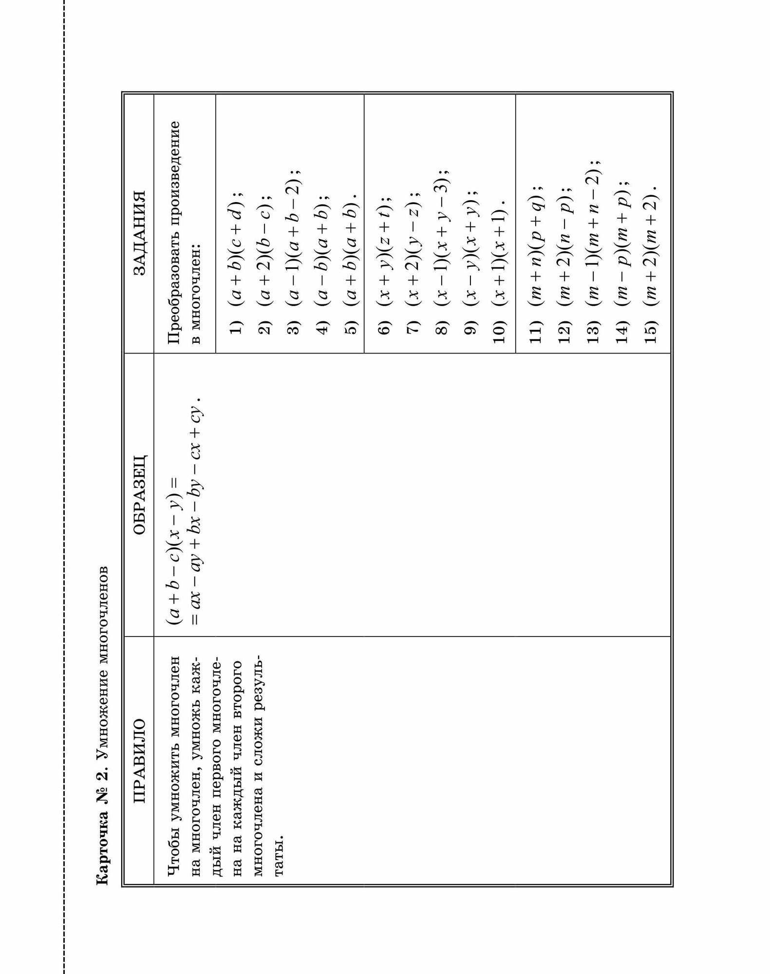 Карточки для коррекции знаний охватывают ключевые вопросы математики по соответствующим темам алгебры и геометрии, предусмотренным школьной программой для 7 класса. Каждая посвящается одному отдельному вопросу и состоит из трёх частей: инструкции (формулировка правил), образца применения этой инструкции и трёх разделов заданий для учащихся.