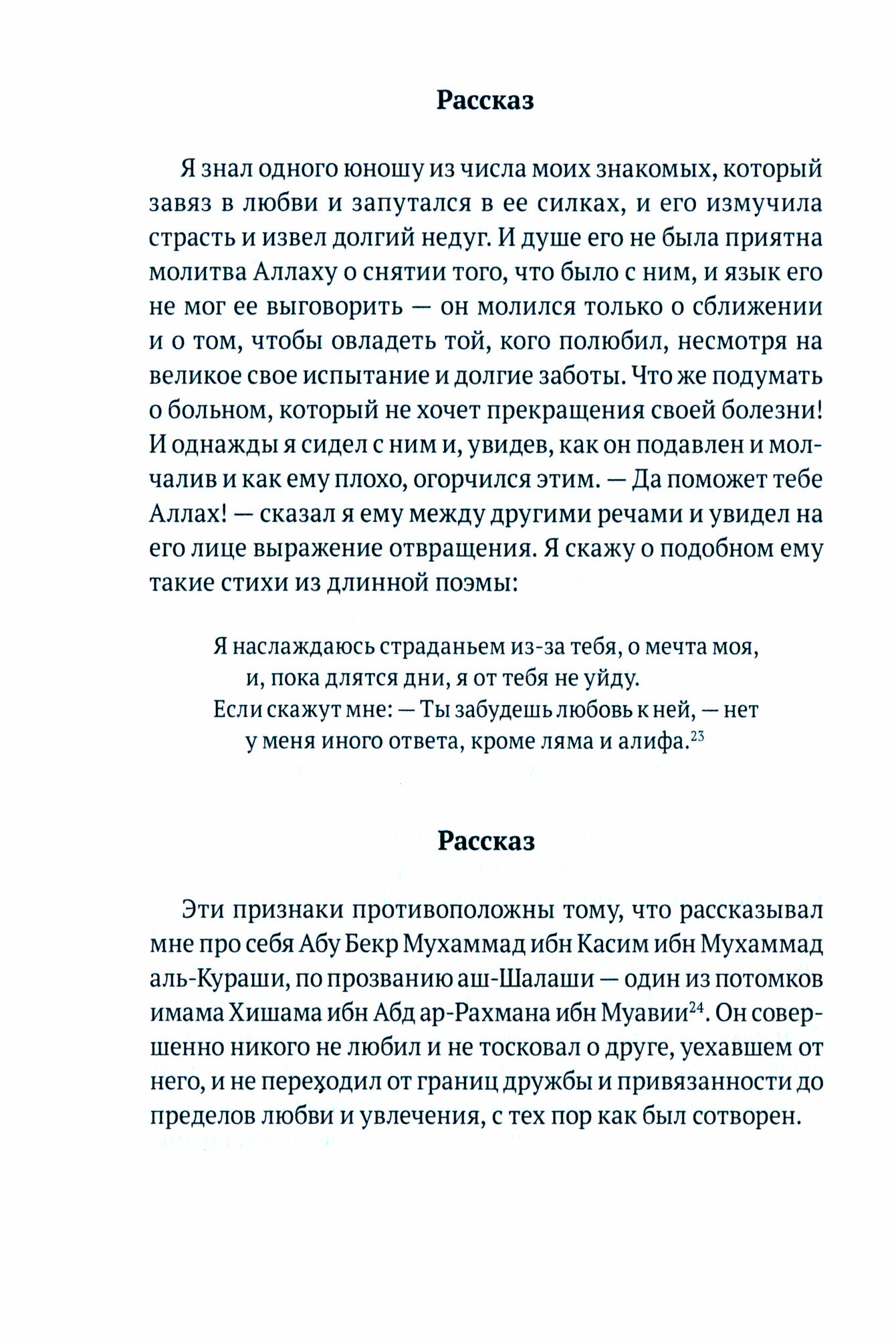 Сочинение представляет собой трактат о любви - жанр, широко распространенный еще в бедуинской поэзии, породившей классические пары Меджнуна и Лейлы, Джемиля и Бусейны и др. Много изучавший литературу и религиозные науки Ибн Хазм, однако, не пожелал следовать устоявшейся традиции. В его исполнении тема любви приобретает невероятную широту. Со схоластической точностью автор описывает причины и свойства сердечного чувства, его разнообразные проявления, характеры и типы возлюбленных. Верным наследию арабской литературы Ибн Хазм остается на уровне слога. Вставные фрагменты - стихотворения и рассказы о реальных историях любви - написаны с тем изысканным поэтическим мастерством, которое знакомо читателю по бессмертной "Тысячи и одной ночи".