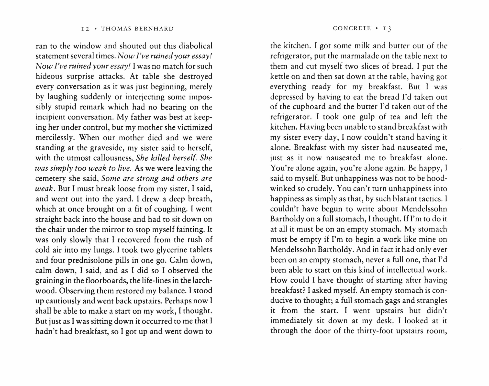 Concrete is Thomas Bernhard at his very finest: a bleakly hilarious insight into procrastination and failure that scratches the murky depths of our souls.