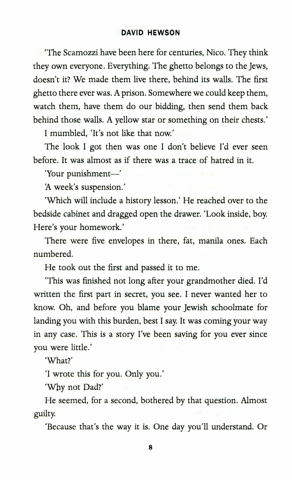 When a Jewish classmate is attacked by bullies, fifteen-year-old Nico just watches – earning him a week’s suspension and a typed, yellowing manuscript from his frail Nonno Paolo. A history lesson, his grandfather says, and a secret he must keep from his father.