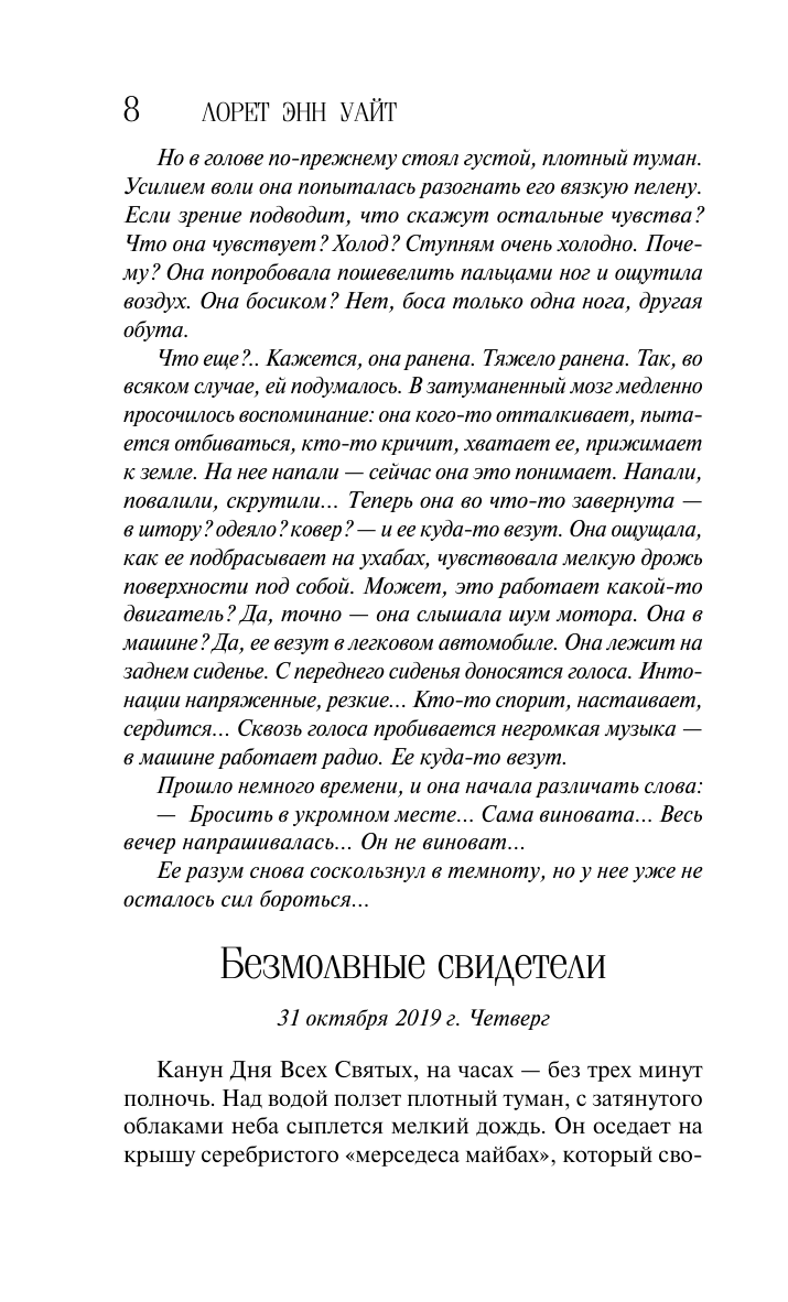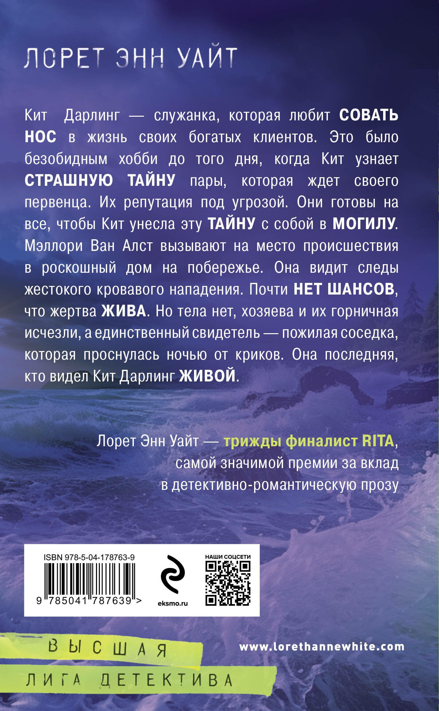 Тайна, ради сохранения которой можно пойти на убийство. Кит Дарлинг — служанка, которая любит совать нос в жизнь своих богатых клиентов. Это было безобидным хобби до того дня, когда Кит узнает страшную тайну пары, которая ждет своего первенца. Их репутация под угрозой. Они готовы на все, чтобы Кит унесла эту тайну с собой в могилу. Мэллори ван Альст вызывают на место происшествия в роскошный дом на побережье. Она видит следы жестокого кровавого нападения. Почти нет шансов, что жертва жива. Но тела нет, хозяева и их горничная исчезли, а единственный свидетель — пожилая соседка, которая проснулась ночью от криков. Она последняя, кто видел Кит Дарлинг живой. Лорет Энн Уайт — лауреат премий «Выбор литературных обозревателей» Romantic Times, «Национальный выбор читателей», «Лучшее произведение в жанре саспенс» и участник финала издательского конкурса Bookseller’s Best. В прошлом — журналистка и редактор СМИ, работала в Южной Африке и Канаде, но сейчас живет вместе с семьей на острове, недалеко от западного побережья Канады. Когда Лорет не трудится над очередной книгой, она катается на лыжах, на велосипеде, уходит в радиальные походы вместе со своим псом (известным под кличкой Черный Зверь) или плавает в океане. Она называет это частью своей работы, потому что именно в такие моменты ее посещают блестящие идеи и сюжеты для новых книг.
