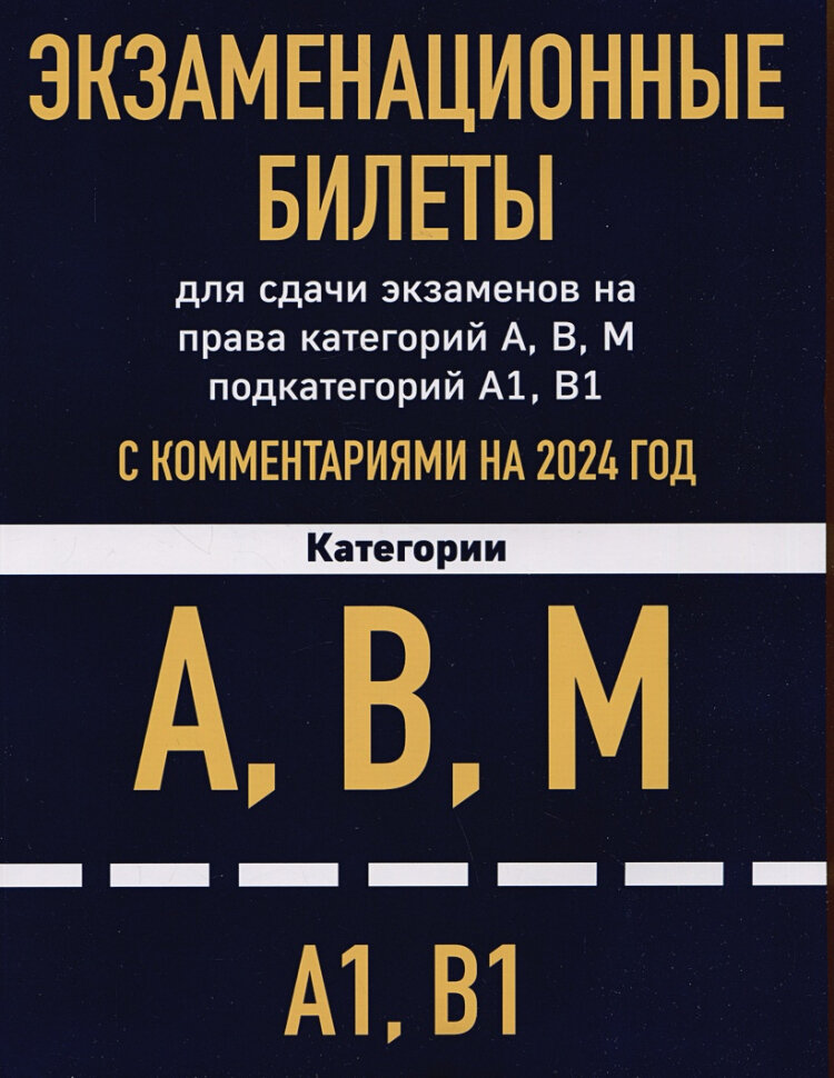 Экзаменационные билеты для сдачи экзаменов на права категорий А В М подкатегорий А1 В1 с комментариями на 2024 год (Волнухина Д. (ред.)); ООО "Издательство "Эксмо", 2023