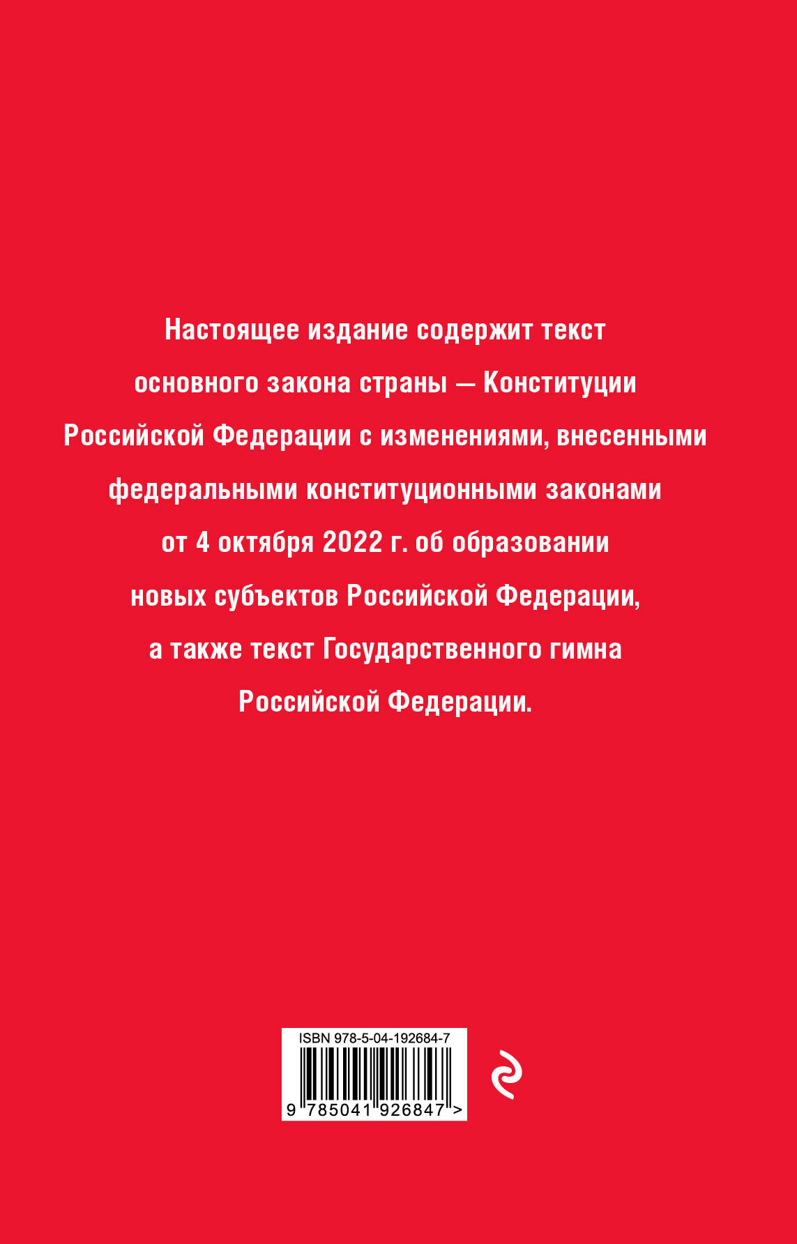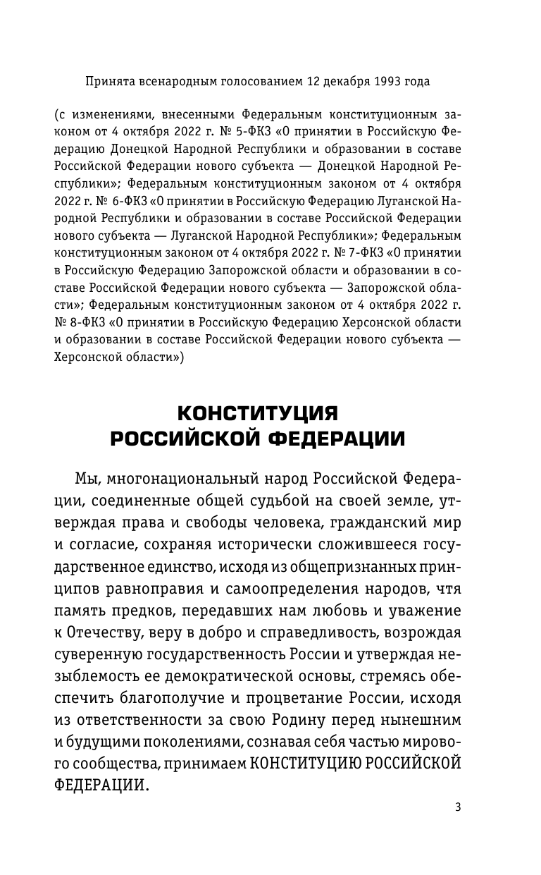 Первое издание Конституции Российской Федерации с последними изменениями, внесенными федеральными конституционными законами от 4 октября 2022 г. об образовании новых субъектов Российской Федерации - Донецкой и Луганской Народных Республик, Запорожской и Херсонской областей.