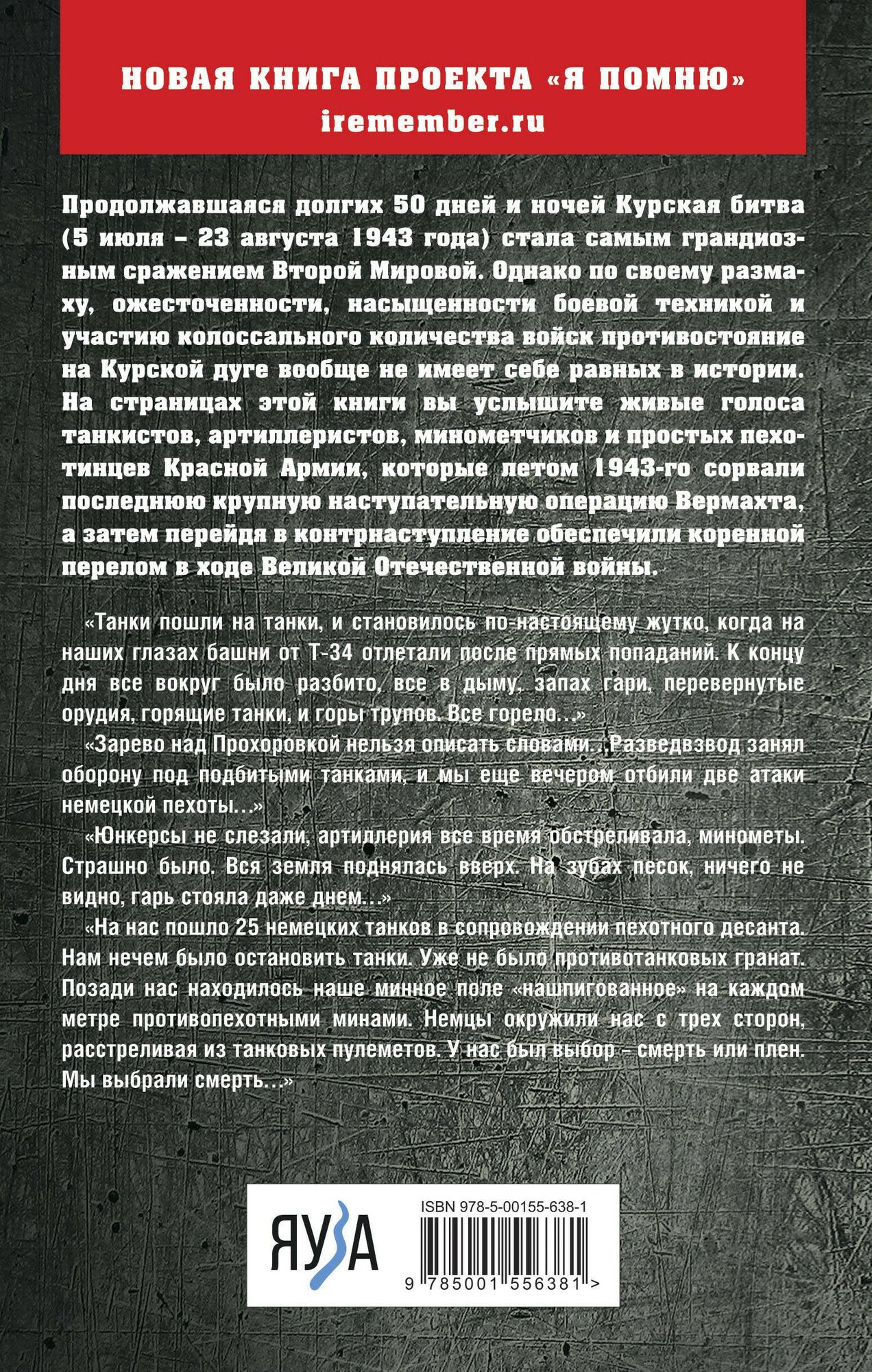 Продолжавшаяся долгих 50 дней и ночей Курская битва (5 июля – 23 августа 1943 года) стала самым грандиозным сражением Второй Мировой. Однако по своему размаху, ожесточенности, насыщенности боевой техникой и участию колоссального количества войск противостояние на Курской дуге вообще не имеет себе равных в истории. На страницах этой книги вы услышите живые голоса танкистов, артиллеристов, минометчиков и простых пехотинцев Красной Армии, которые летом 1943-го сорвали последнюю крупную наступательную операцию Вермахта, а затем перейдя в контр наступление обеспечили коренной перелом в ходе Великой Отечественной войны.