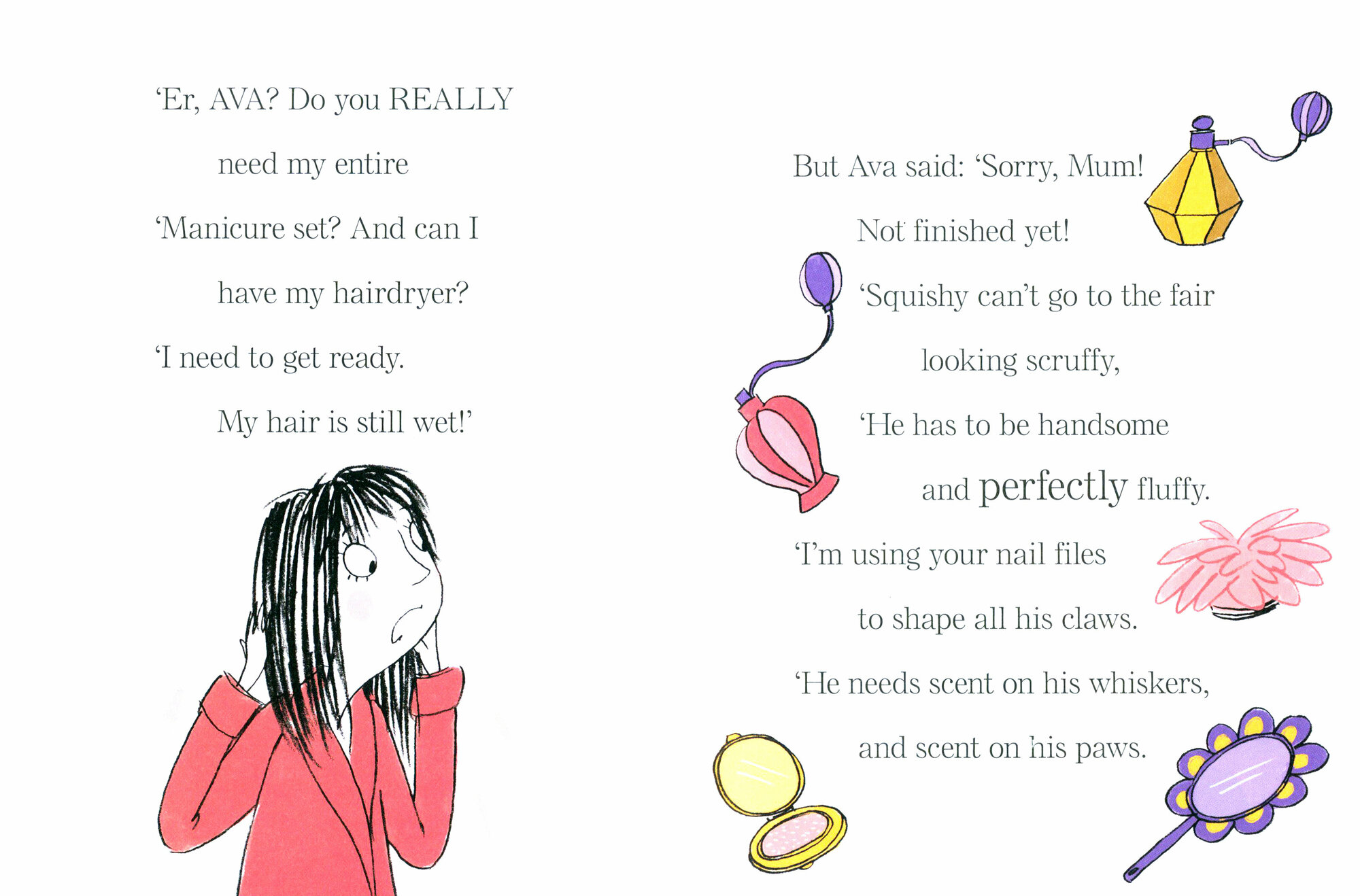 Squishy McFluff has been blow-dried and primped to perfection. He must win the Country Fair prettiest pet competition – and will if Ava has anything to do with it . . .