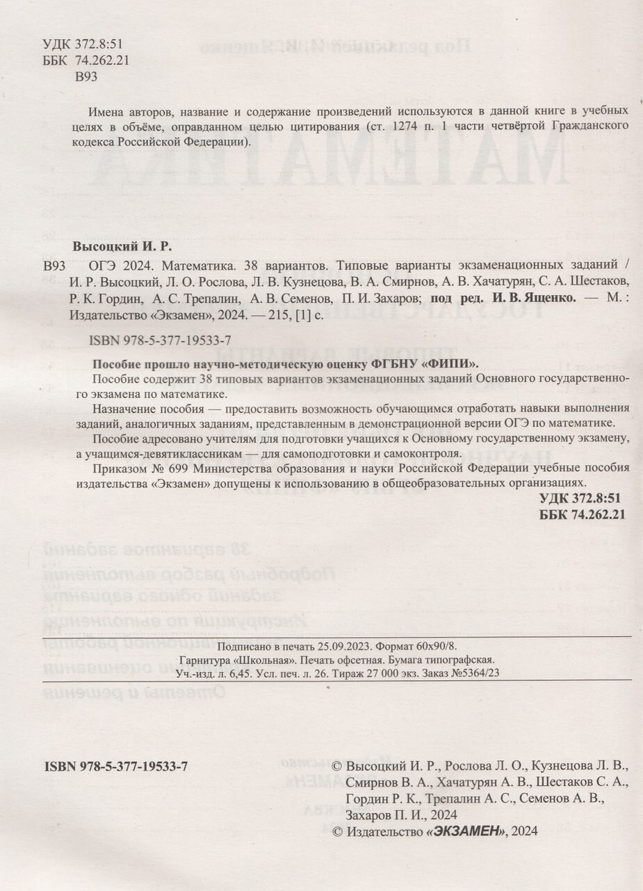ОГЭ-2024. Математика. 38 вариантов. Типовые варианты экзаменационных заданий (Высоцкий Иван Ростиславович, Кузнецова Людмила Викторовна, Рослова Лариса Олеговна); Экзамен, 2024