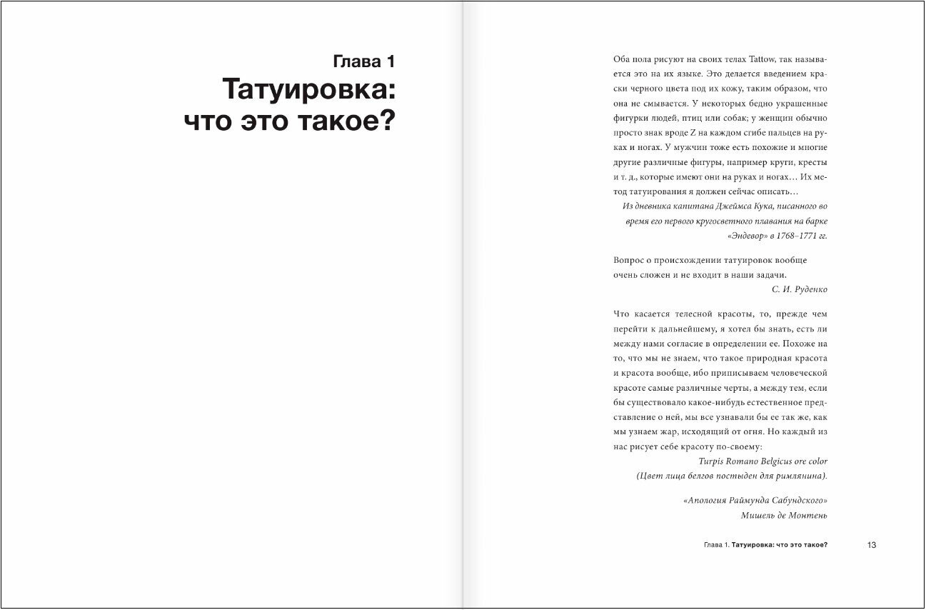 Так, жители Борнео верили, что их рисунки — факелы, освещающие путь душам в темноте царства мертвых; греки и римляне использовали татуировки как наказание; для алтайских скифов наколка служила воплощением священного текста. А как объяснить современную популярность телесных модификаций? Этот вопрос автор тоже не оставляет без внимания. Исследования татуировок помогают лучше разобраться в символическом языке, которым люди выражали свои мечты, верования и статус. Зачастую эти изображения есть живые истории, повествующие нам о прошлом.