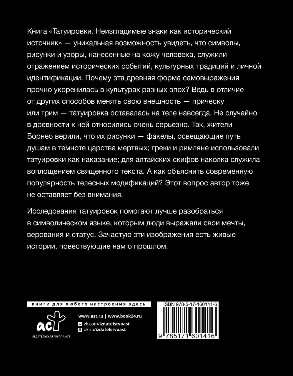 Книга «Татуировки. Неизгладимые знаки как исторический источник» — уникальная возможность увидеть, что символы, рисунки и узоры, нанесенные на кожу человека, служили отражением исторических событий, культурных традиций и личной идентификации. Почему эта древняя форма самовыражения прочно укоренилась в культурах разных эпох? Ведь в отличие от других способов менять свою внешность — прическу или грим — татуировка оставалась на теле навсегда. Не случайно в древности к ней относились очень серьезно.