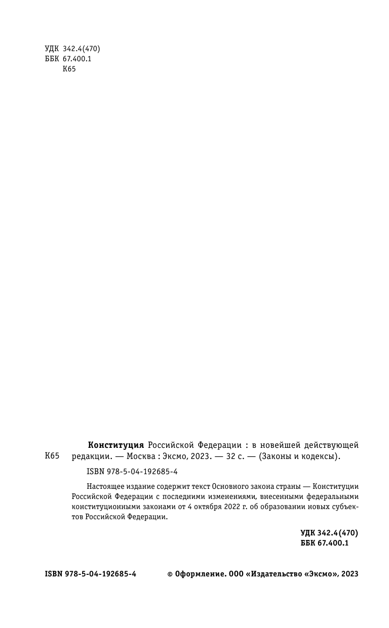 Настоящее издание содержит текст Основного закона страны – Конституции Российской Федерации с последними изменениями, внесенными федеральными конституционными законами от 4 октября 2022 г. об образовании новых субъектов Российской Федерации