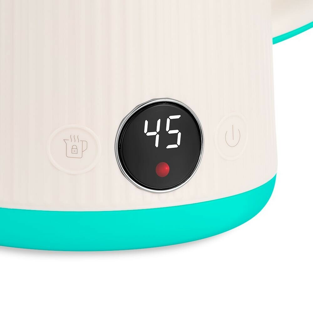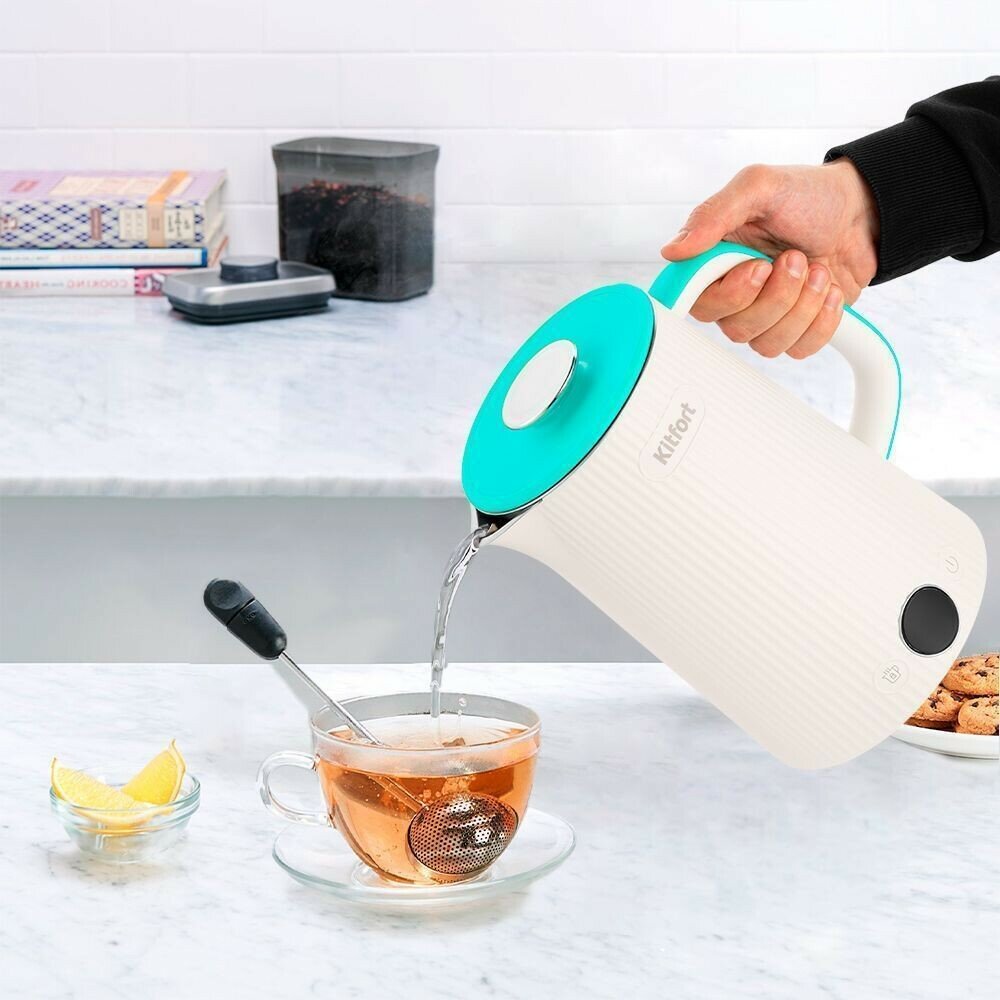 Электрический чайник с электронным терморегулятором Kitfort КТ-6197 может не только вскипятить воду, но и нагреть её до температур: 45, 55, 65, 75 и 85°С. Ручка чайника пластиковая, не нагревается и удобно лежит в руке. Ёмкость чайника 1.7 л. Кнопка «Вкл/Выкл» включает и выключает чайник. Кнопка «Поддержание температуры» циклически переключает температуру для поддержания 45, 55, 65, 75, 85 °С. На дисплее отображается текущая температура воды в чайнике. Корпус чайника и крышка выполнены из пластика, а внутренняя колба чайника и внутренняя часть крышки изготовлены из нержавеющей стали. Съёмная крышка и большое горлышко чайника облегчают доступ внутрь при его мойке и во время удаления накипи. Полный чайник закипает за 6–7 минут. При закипании чайник автоматически отключится. Прибор имеет защиту от перегрева и от включения без воды: при включении без воды чайник нагревается и отключается (срабатывает защита от перегрева). Подставка с центральным контактом дает возможность располагать на ней чайник в любом положении, обеспечивая вращение на 360°. Снизу имеется отсек для хранения шнура, в который можно смотать излишки шнура электропитания, чтобы он не мешал на столе. Для увеличения срока службы чайника своевременно удаляйте накипь. Поместите в чайник специальное средство, залейте 0.5 л воды и доведите до кипения. После вскипятите в нем воду и слейте её. Для предотвращения накипи используйте фильтрованную воду.