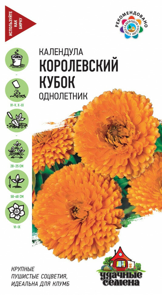 Популярное, неприхотливое растение из семейства Астровые, высотой 50-60 см. Соцветия крупные, диаметром 5-6 см, темно-оранжевые. Обильно и продолжительно цветет, особенно если своевременно удалять отцветшие соцветия. Календула светолюбива и предпочитает легкие почвы, холодостойка - выдерживает заморозки до -5 градусов Цельсия. Размножают прямым посевом в грунт. Всходы появляются через 7-10 дней, их через некоторое время прореживают, оставляя расстояние между растениями 20 - 25 см. Используют для оформления участка и для выращивания в балконных ящиках.