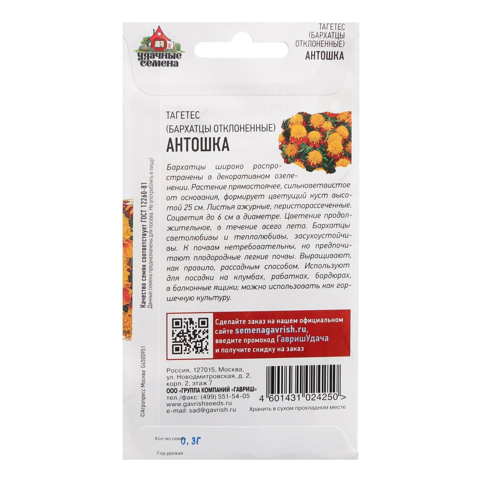 Модель: Семена Удачные семена Бархатцы отклоненные Антошка Тагетес 0.3 г