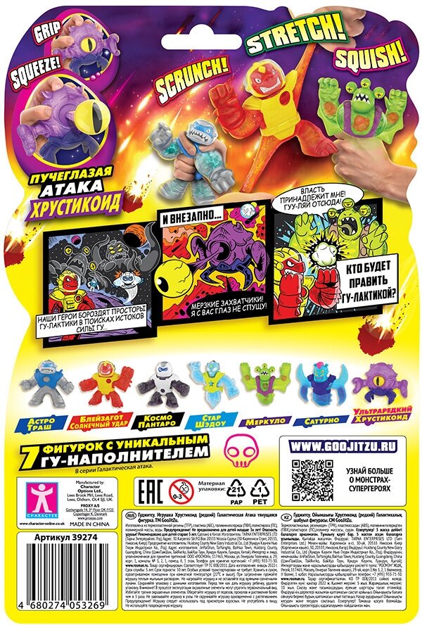 Герои Гуджитсу отправились бороздить просторы Гу-лактики в поисках истоков силы ГУ! Любимых героев ждут космические приключения с новой серией Галактическая Атака!Сила Гу растет и теперь вышла на галактический уровень! Сражайтесь двумя эксклюзивными фигурками Гуджитсу из набора и познайте Космическую ярость! В космическом костюме и шлеме с открывающимся забралом Солнцеподобный Блейзагот готов сразиться с Воином Тени Террэком!Тянущиеся фигурки Блейзагот и Террэк ТМ Гуджитсу серии Галактическая Атака приятны на ощупь, растягиваются в 3 раза. Высота фигурок Блейзагота и Террэка 12см и 12,5см соответственно.Внутри Блейзагота мягкие полимерные шарики, а Террэк наполнен жидкостью с полимерными элементами в виде скелета. У фигурок съемная одежда из эластичного материала. У Блейзагота также есть подвижное забрало на шлеме.Игрушка изготовлена из полимерных материалов (ТПР, АБС, ПВХ, ПЭТ, акрил), воды.Товар безопасен для детского использования.